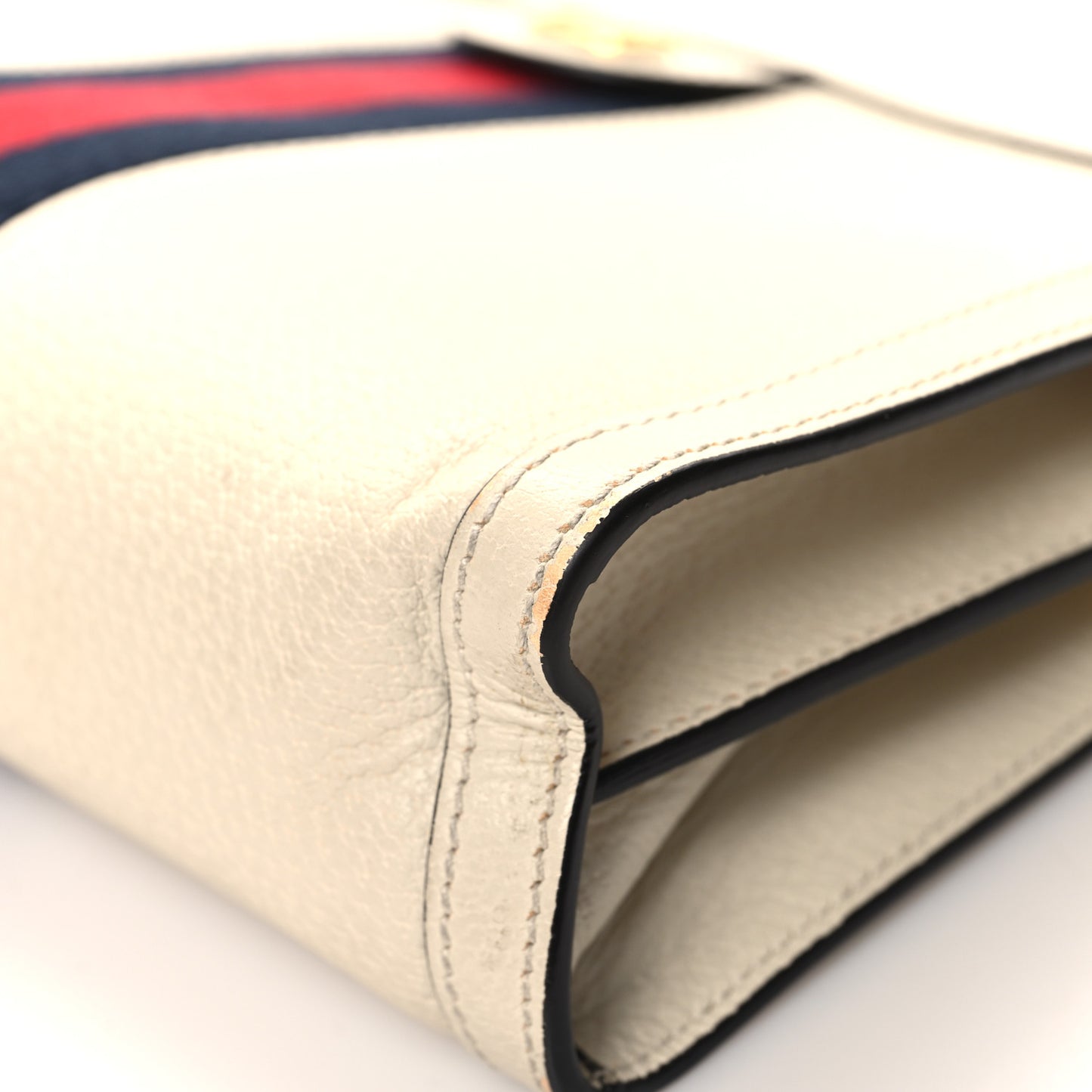 This is the authentic GUCCI Textured Calfskin Web Small Ophidia Chain Shoulder Bag in Mystic White. This chic shoulder bag is crafted of calfskin leather in white with a navy and red web stripe through the middle. The bag features a polished gold chain shoulder strap and gold hardware. The magnetic top opens to a partitioned nude microfiber interior with a patch pocket.