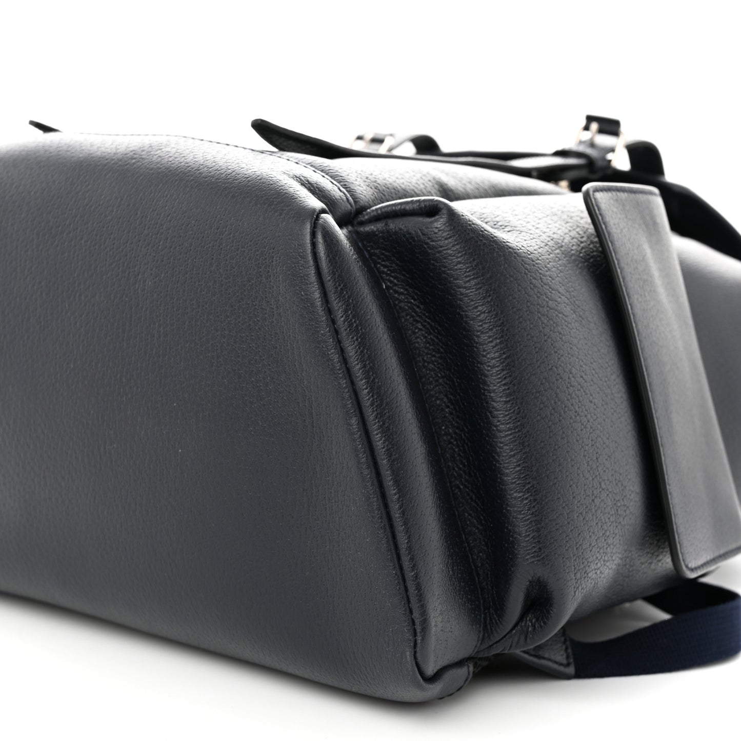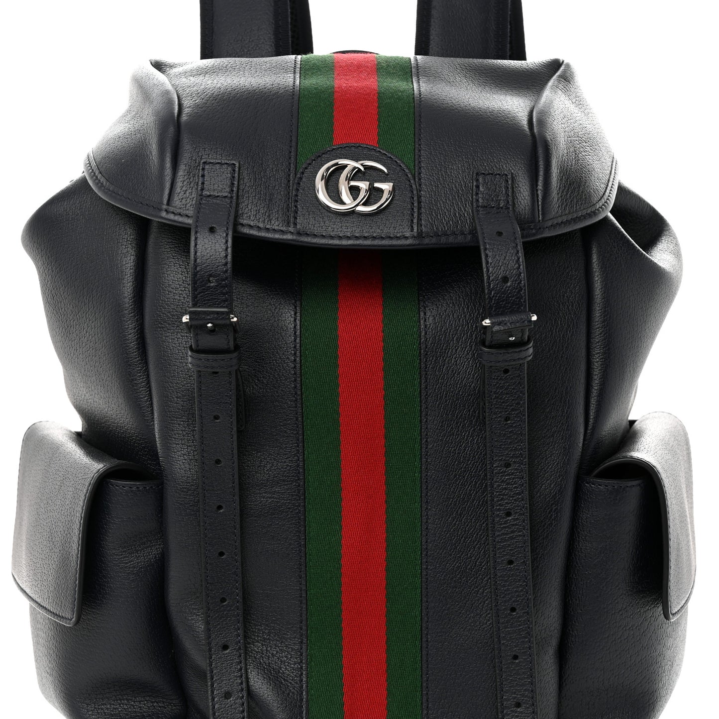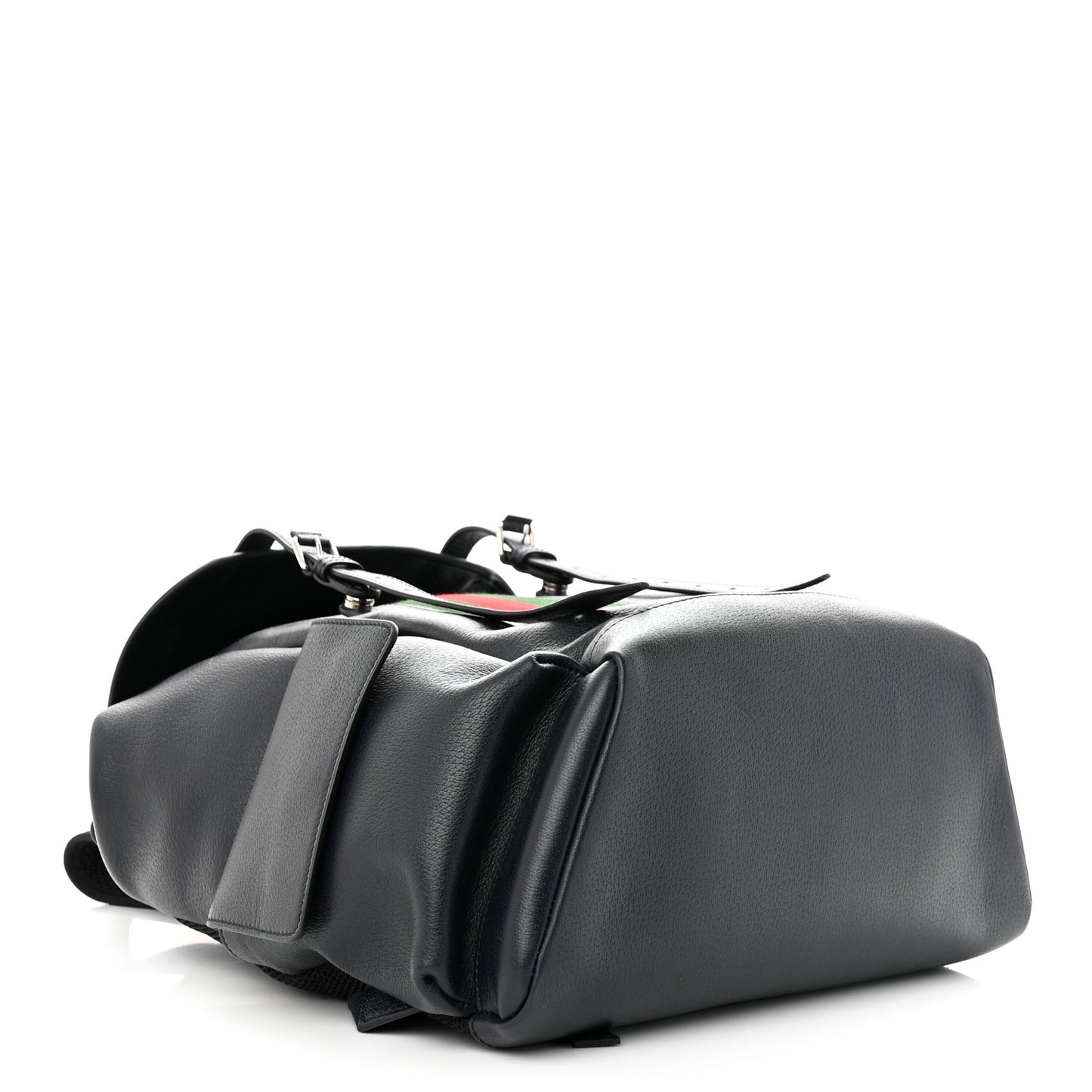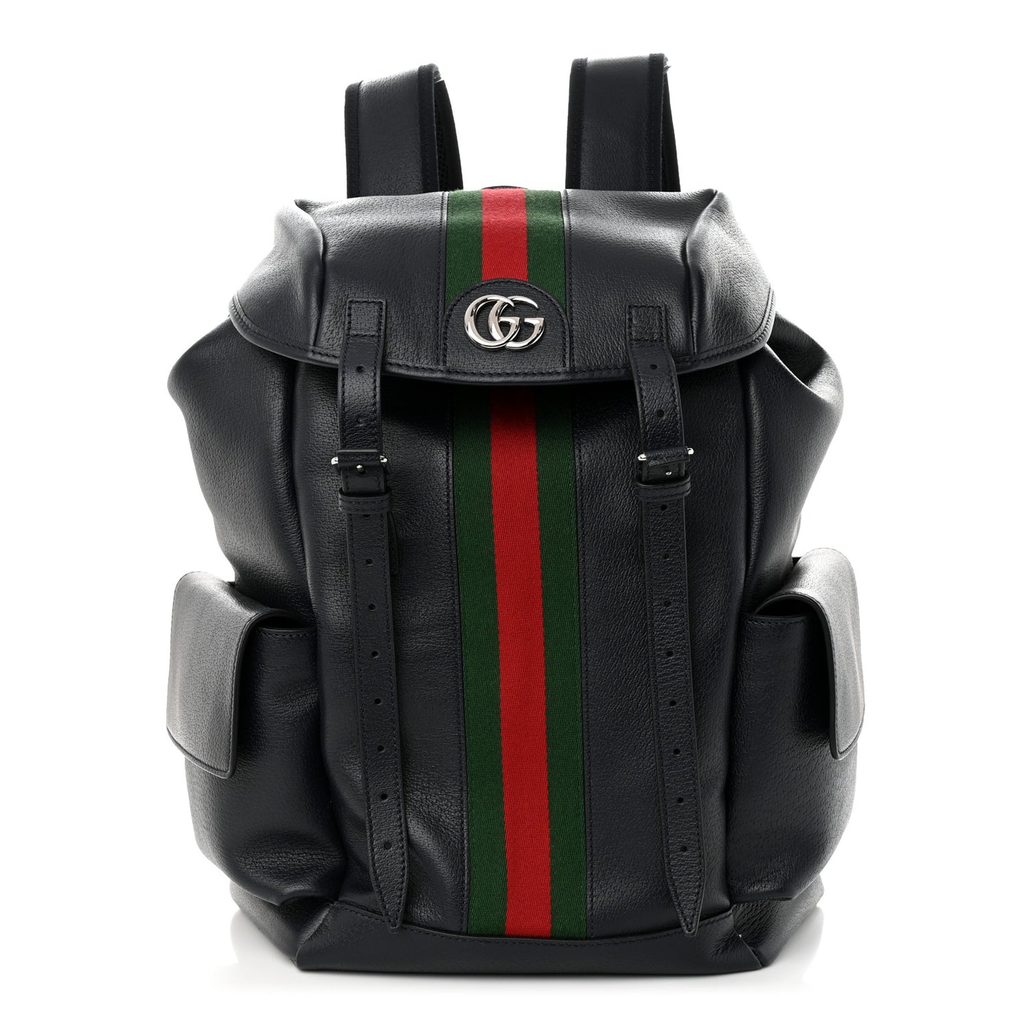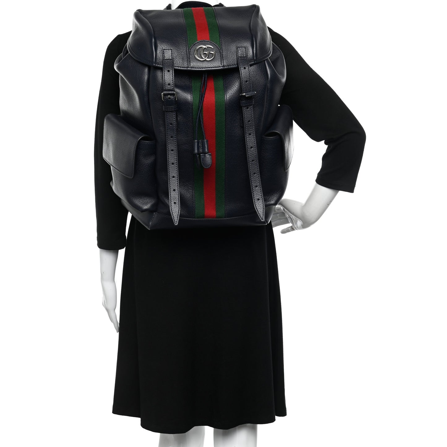 This is an authentic GUCCI Textured Dollar Calfskin Web Medium Ophidia Double Buckle Backpack in Blue Agata. This bag is crafted in navy blue leather with a red and green stripe down the middle. It features silver GG logo on the top flap, buckle strap and cinch strap closure, exterior flap pockets, and adjustable nylon shoulder straps. The bag opens to a spacious beige interior with a padded sleeve for an electronic device and card slots.Follow this item for alerts. Gucci is a registered trademark of Gucci. FASHIONPHILE is not affiliated with Gucci.