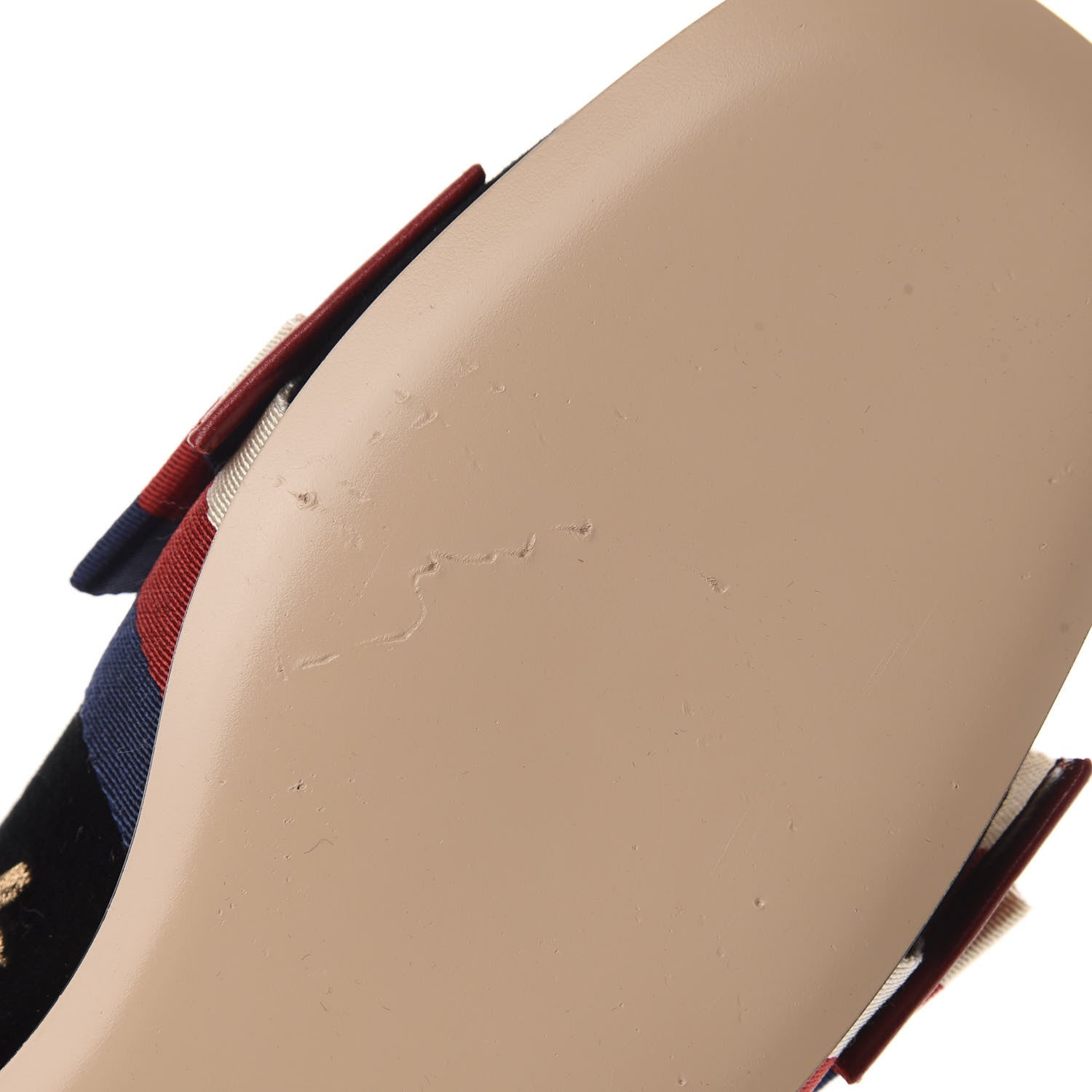 These are authentic GUCCI Velvet Embroidered Bee Sylvie Bow Loafers size 37.5 in Black. These shoes are crafted of fine black velvet and have calfskin leather interiors. They feature a red, white and blue bow with stitched bees and stars. These are lovely mules with a distinctive look, only by Gucci!