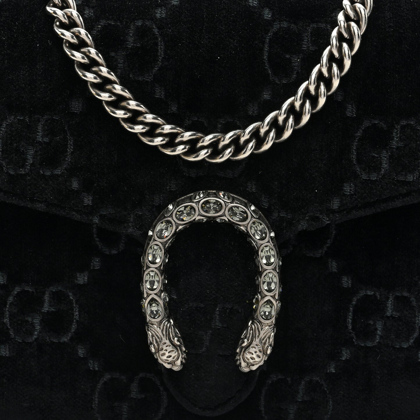 This is an authentic GUCCI Velvet GG Monogram Mini Dionysus Chain Wallet in Black. This stylish bag is crafted of Gucci monogram on black velvet. This bag features an optional silver chain shoulder strap and a textured horseshoe closure with tiger heads and crystals. This opens to a black fabric and leather interior with card slots, pockets, and a zipper compartment.Follow this item for alerts. Gucci is a registered trademark of Gucci. FASHIONPHILE is not affiliated with Gucci.