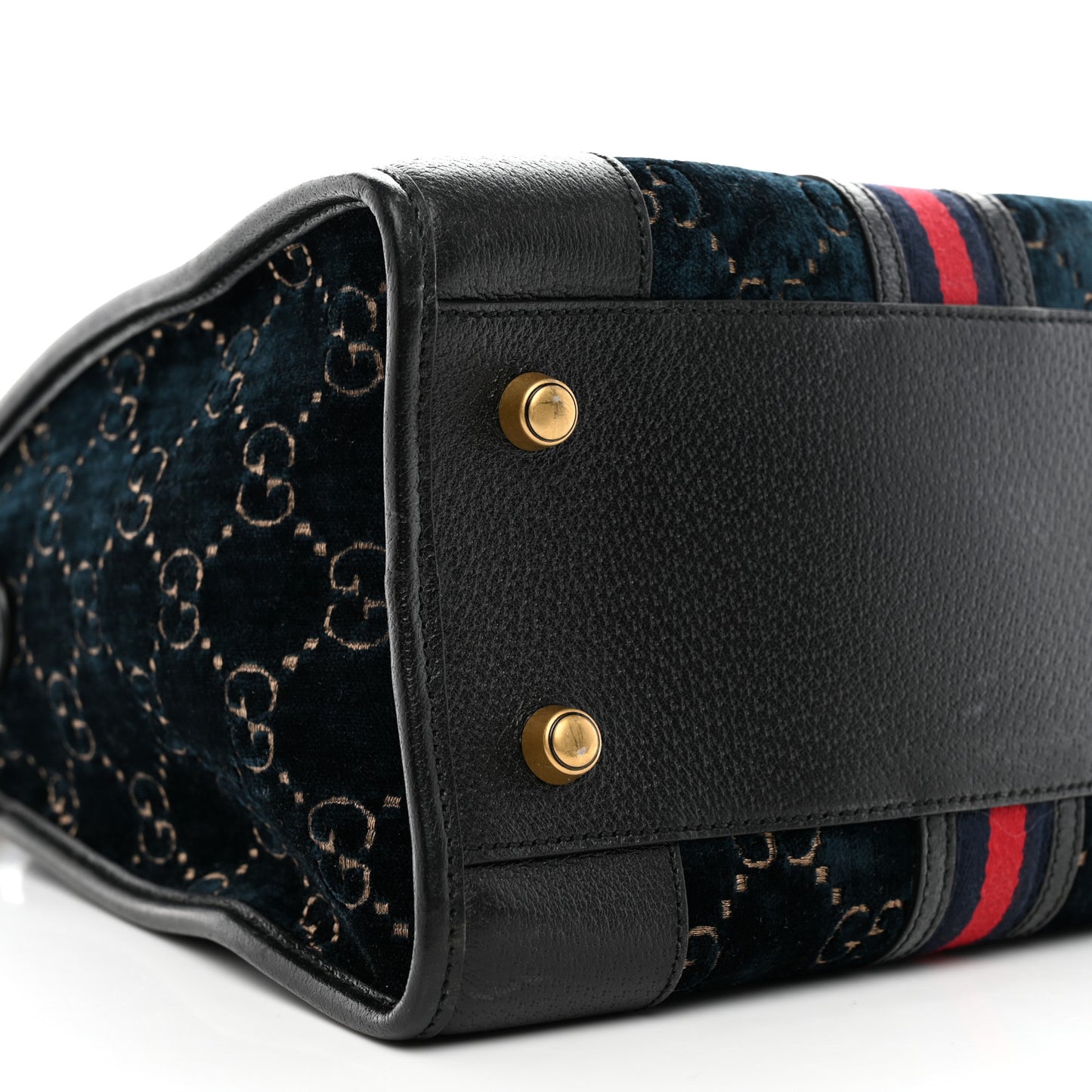 Gucci/ Bags/ Travel & Luggage /Gucci Velvet GG Monogram Textured Calfskin Web Medium Duffle Bag Blue Beige Black