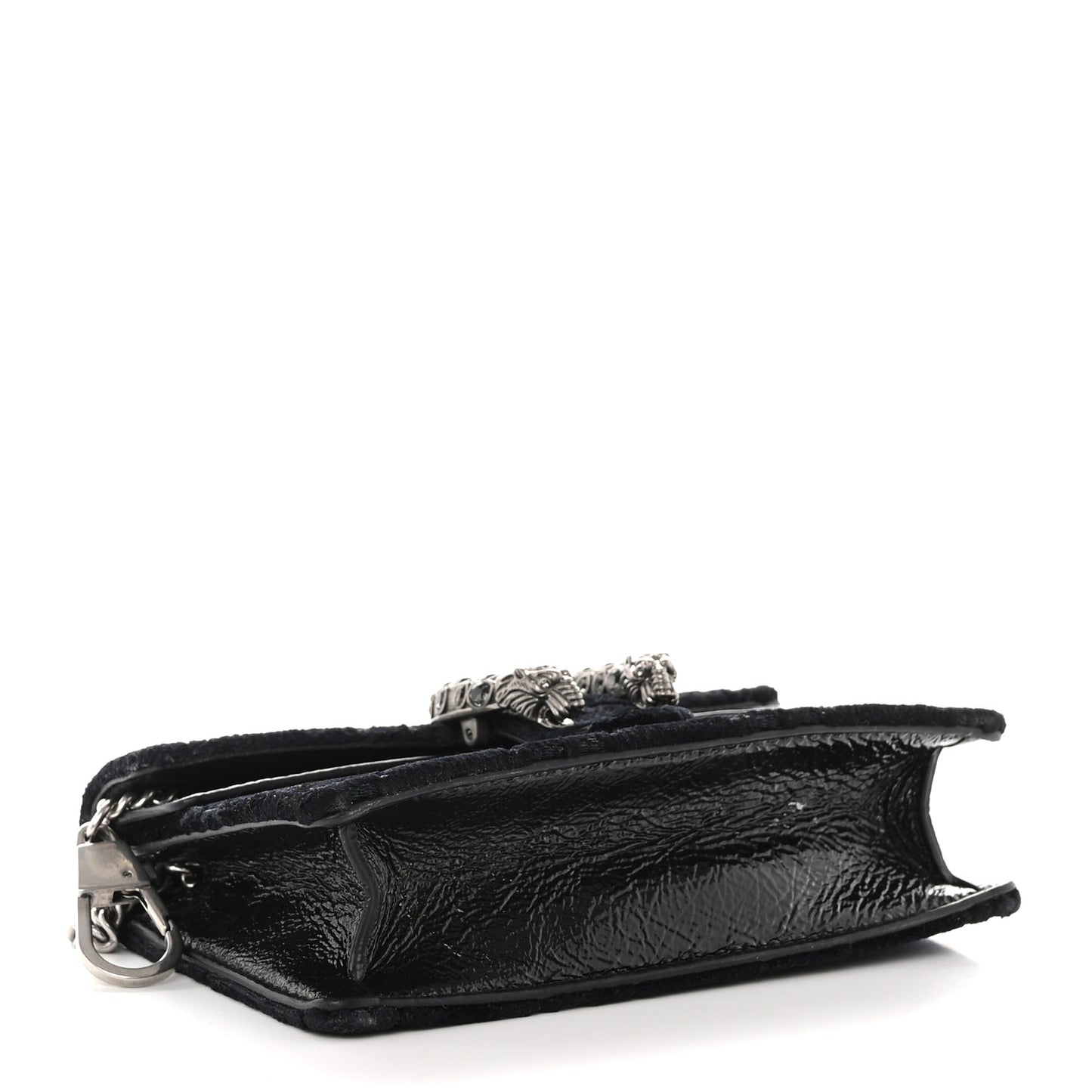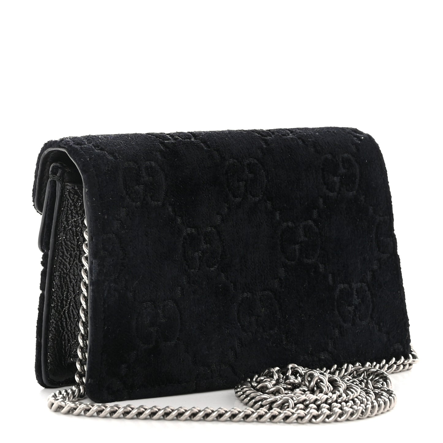 This is an authentic GUCCI Velvet Super Mini Dionysus Bag in Black. This petite bag is crafted of velvet in black. This shoulder bag features an aged silver chain shoulder strap and a textured horseshoe tiger spur closure. The flap opens to a beige interior with a key ring.Follow this item for alerts. Gucci is a registered trademark of Gucci. FASHIONPHILE is not affiliated with Gucci.