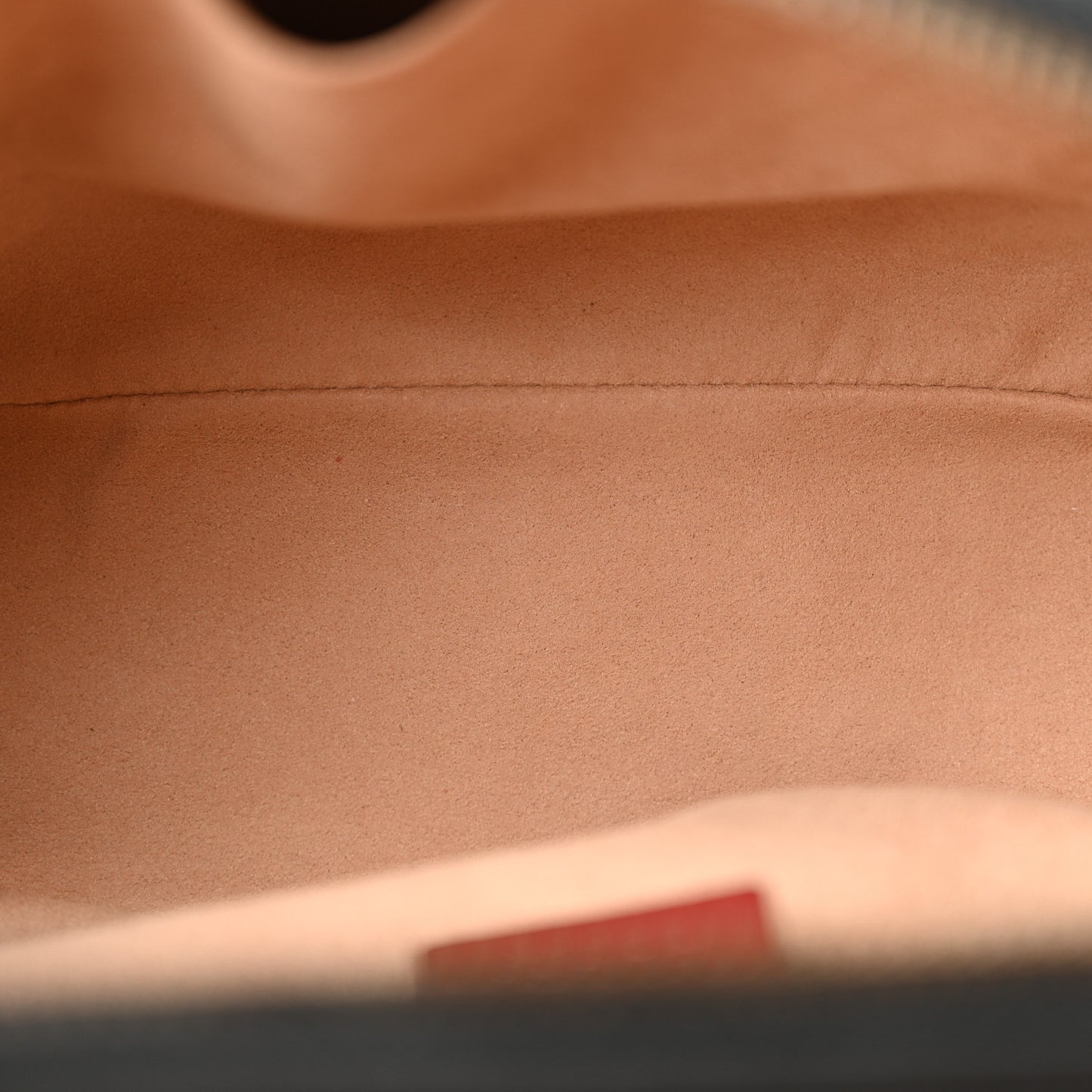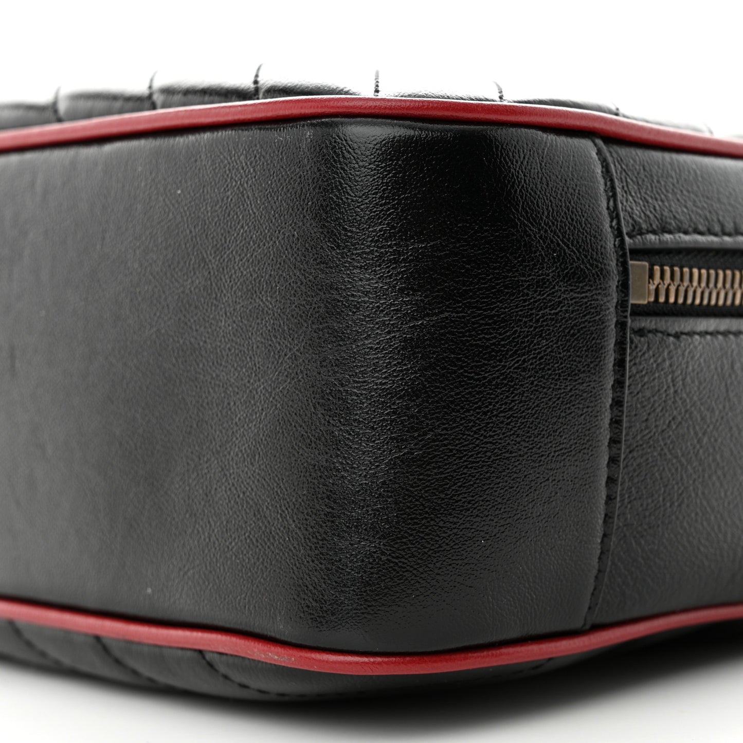 This is an authentic GUCCI Vintage Effect Calfskin Matelasse Diagonal Small Torchon GG Marmont Bamboo Top Handle Shoulder Bag in Black and Romantic Cherry. This shoulder bag is crafted of glossy calfskin leather in black. This bag features red leather trim, a bamboo top handle, a textured gold interlocking GG logo, and an optional aged gold chain link shoulder strap with a red leather shoulder pad. The wrap around double tassel zippers open the bag to a beige microfiber interior with zipper and patch pockets.Follow this item for alerts. Gucci is a registered trademark of Gucci. FASHIONPHILE is not affiliated with Gucci.