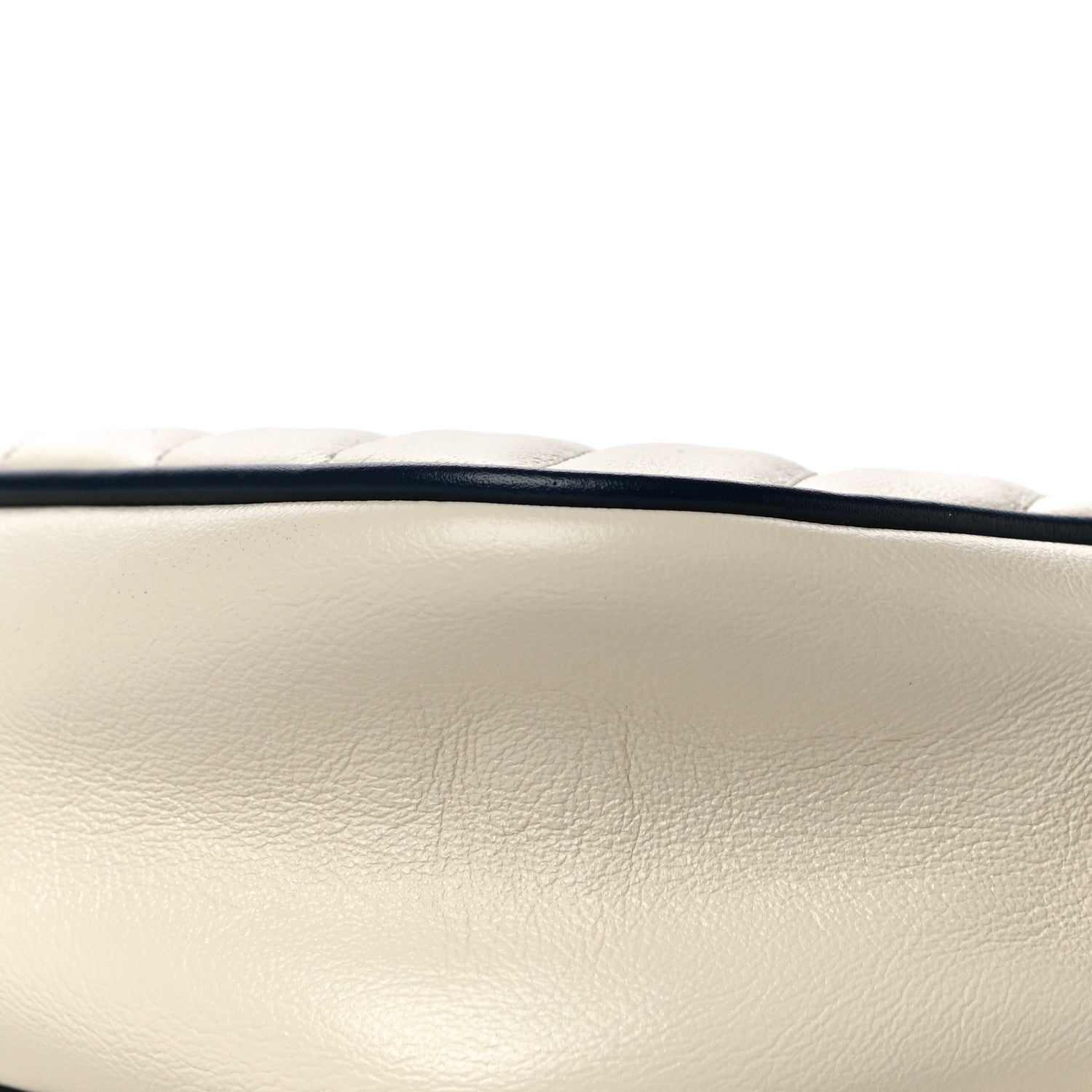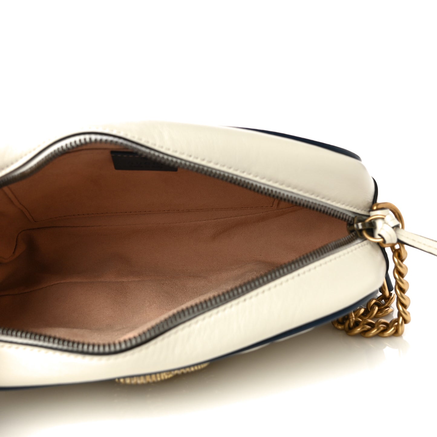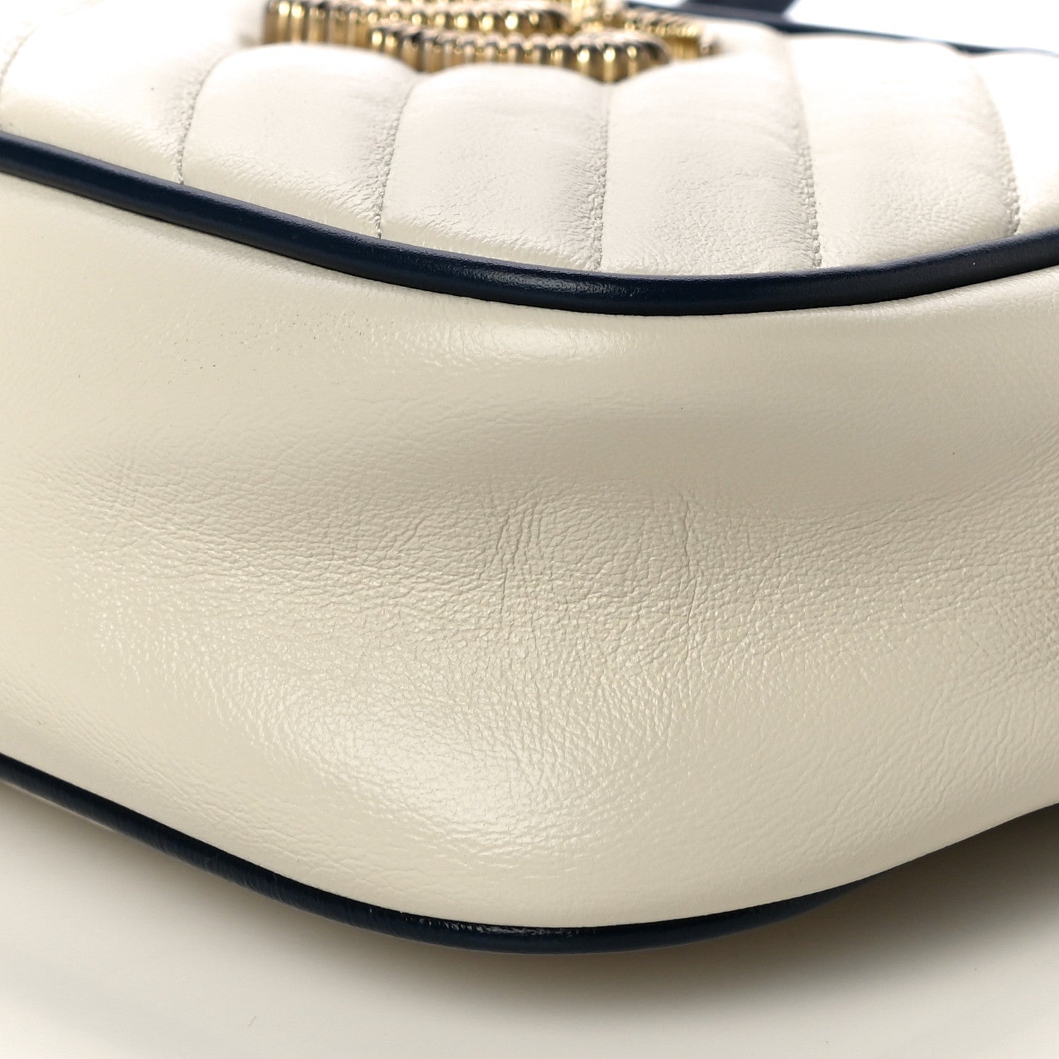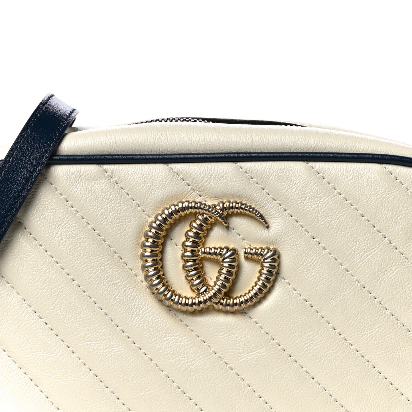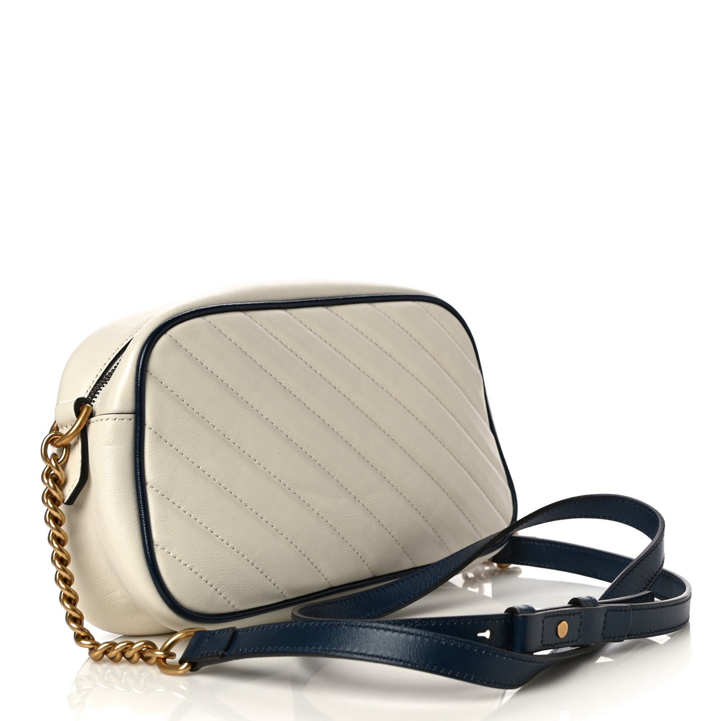 This is an authentic GUCCI Vintage Effect Calfskin Matelasse Diagonal Small Torchon GG Marmont Chain Shoulder Bag in White and Blue. This stylish handbag is crafted of soft calfskin leather in off white with a diagonal quilt and navy blue leather accents. This shoulder bag features an aged gold chain and leather shoulder strap with a textured gold Gucci GG logo on the front. The top zipper opens to a beige fabric interior with a patch pocket.