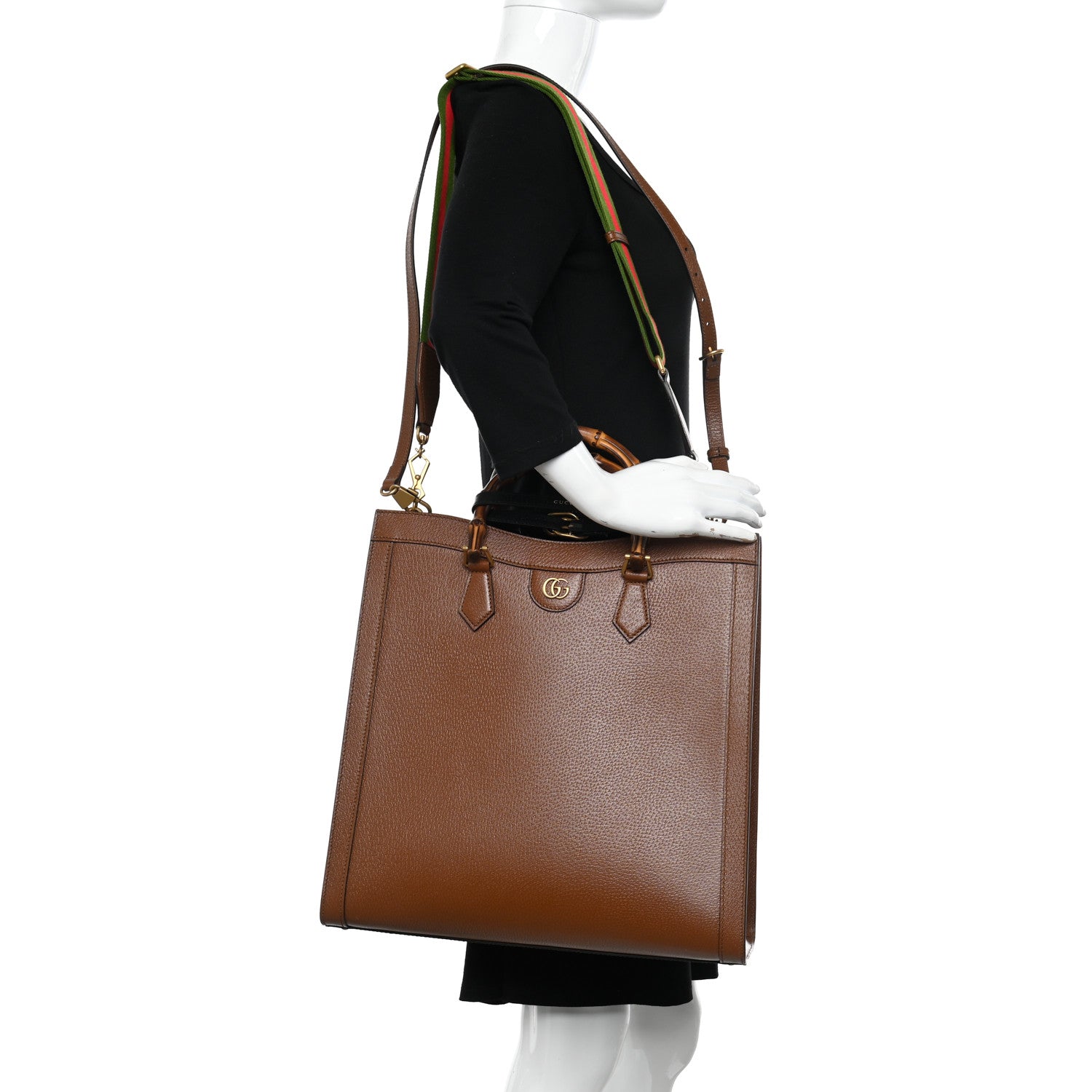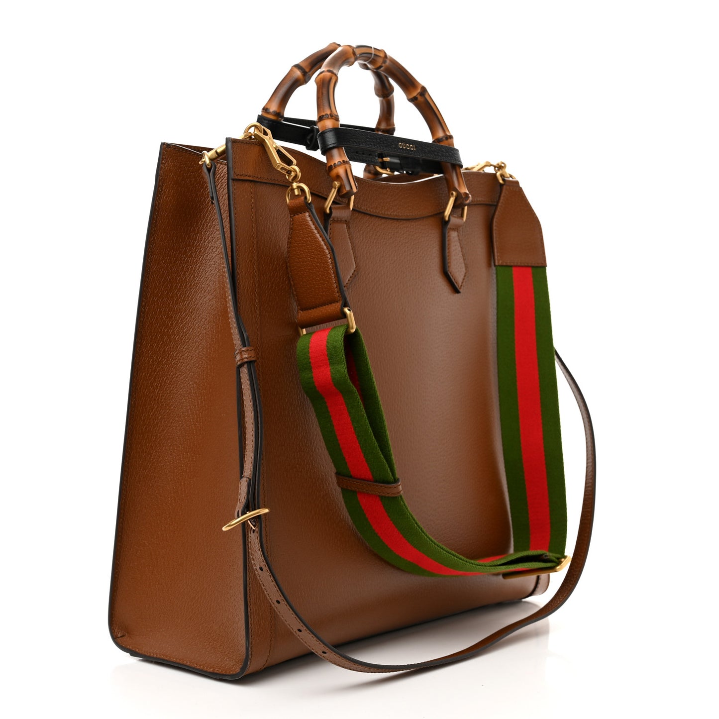 This is an authentic GUCCI Wonka Grain Calfskin Large Diana Tote Bag in Cuir and Black. This shoulder bag is crafted of lovely calfskin leather in brown. The bag has a sturdy bamboo top handle, a leather adjustable strap, an optional red and green striped shoulder strap, and an aged gold hardware. The top opens to a beige interior with a zipper pocket.Follow this item for alerts. Gucci is a registered trademark of Gucci. FASHIONPHILE is not affiliated with Gucci.