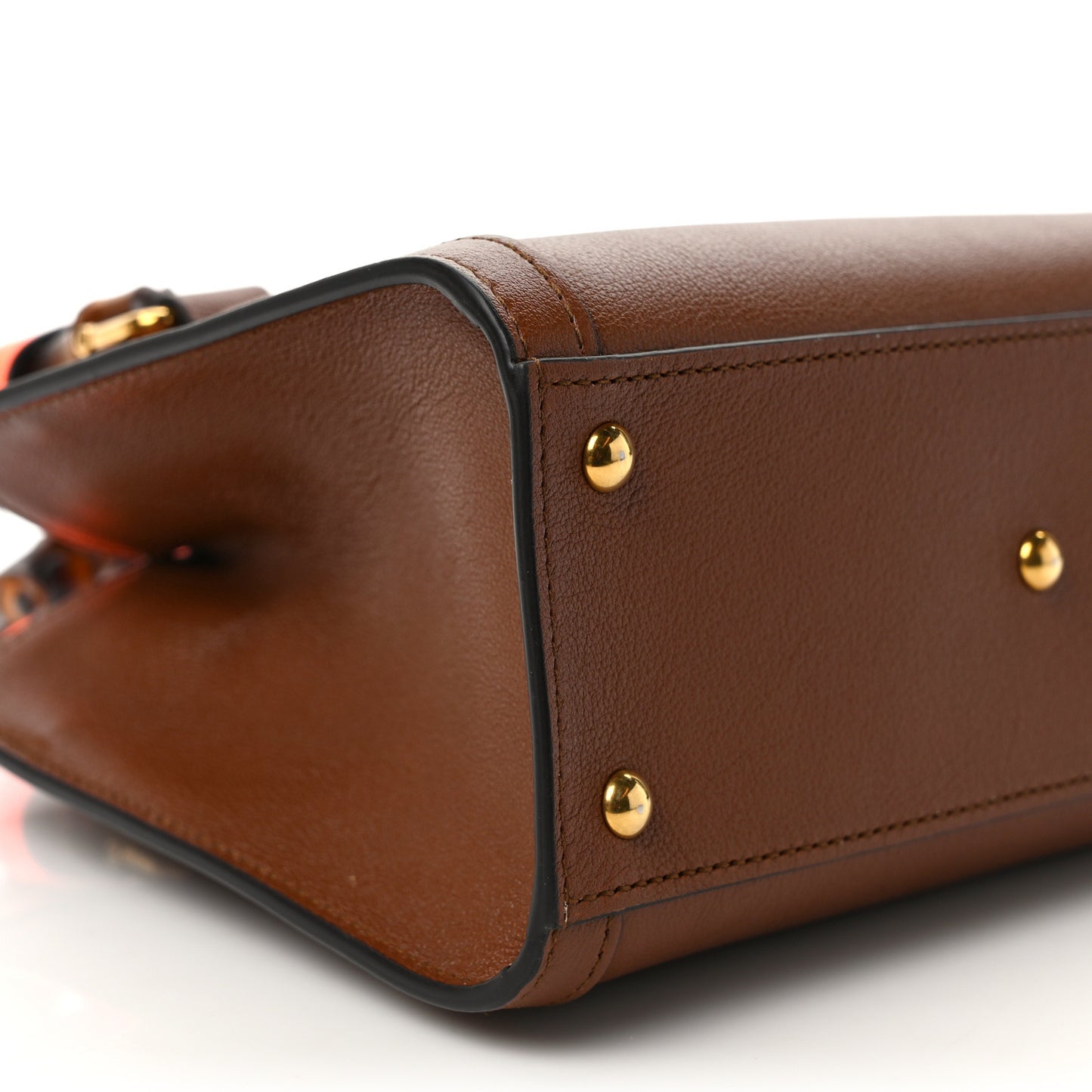 This is an authentic GUCCI Wonka Grain Calfskin Mini Diana Tote Bag in Cuir and Orange Fluo. This shoulder bag is crafted of lovely calfskin leather in brown. The bag has a sturdy bamboo top handle and features an interlocking GG logo, the handbag opens to a beige micro fabric interior.