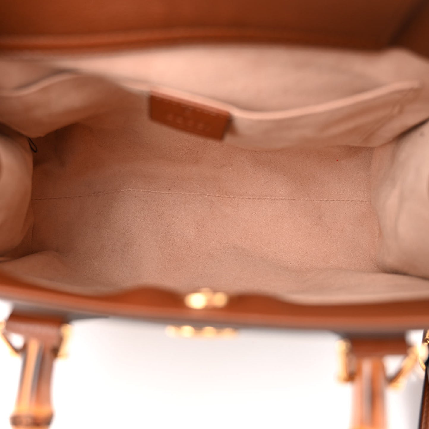 This is an authentic GUCCI Calfskin Small Diana Tote Bag in Cuir and Yellow Fluo. This shoulder bag is crafted of lovely calfskin leather in a brown. The bag has a sturdy bamboo top handle and featuring an interlocking GG logo, the handbag opens to a beige micro fabric interior with a patch pocket.Follow this item for alerts. Gucci is a registered trademark of Gucci. FASHIONPHILE is not affiliated with Gucci.