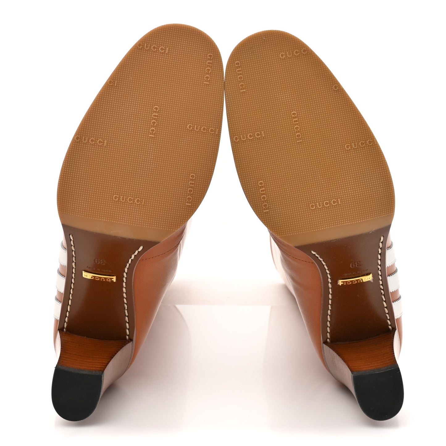 This is an authentic pair of GUCCI X ADIDAS Calfskin Elizabeth Knee Boots size 39 in Royal Cognac and Great White. These bold boots are crafted of brown leather and feature three white vertical lines, a round toe and a heel standing at 2.75 inches.