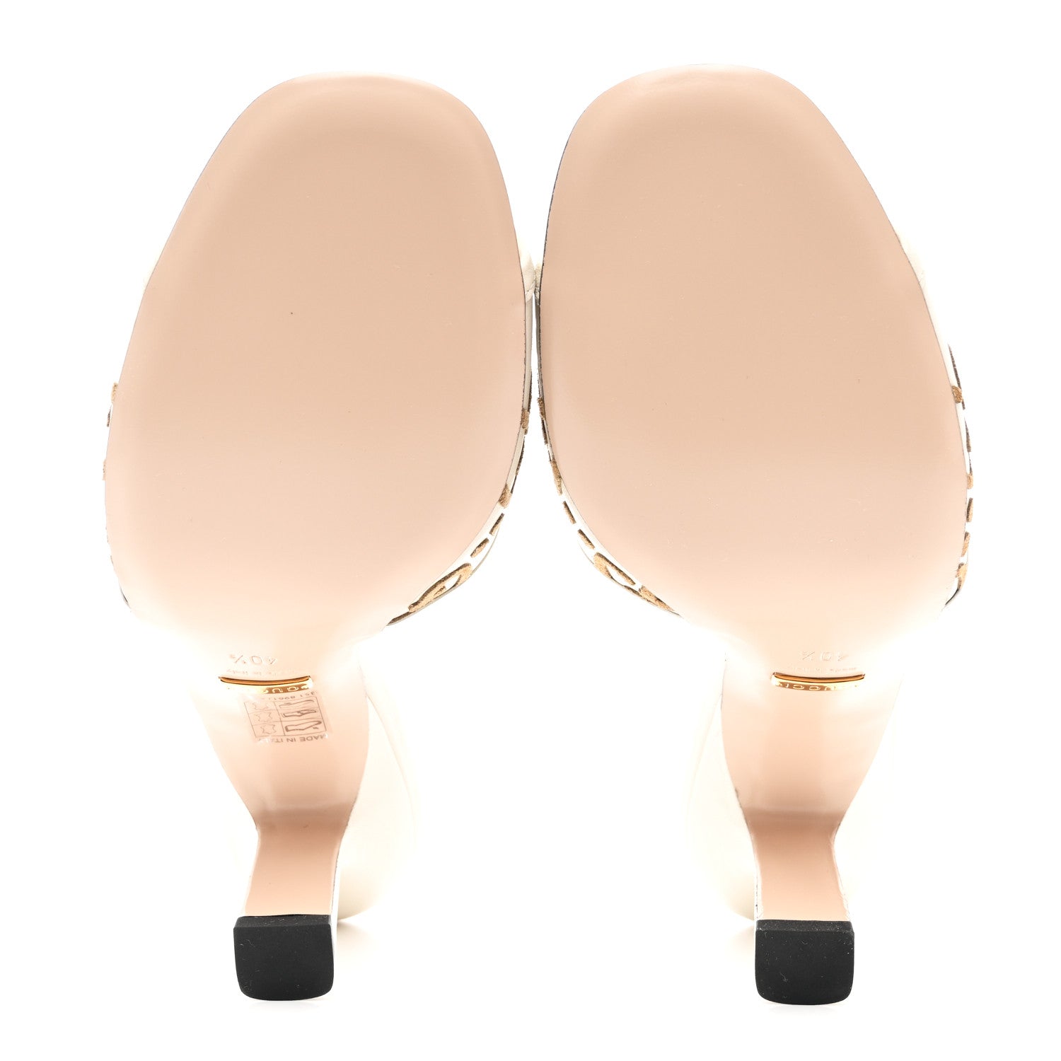 This is an authentic pair of GUCCI X ADIDAS Nappa Suede Monogram Jumbo GG Trefoil 75mm Slide Sandals size 40.5 in New Mystic White and Sand. These chic sandals are crafted of white leather and brown monogram Gucci and Adidas logo. They feature a leather 3.5-inch covered heel.Follow this item for alerts. Gucci is a registered trademark of Gucci. FASHIONPHILE is not affiliated with Gucci.