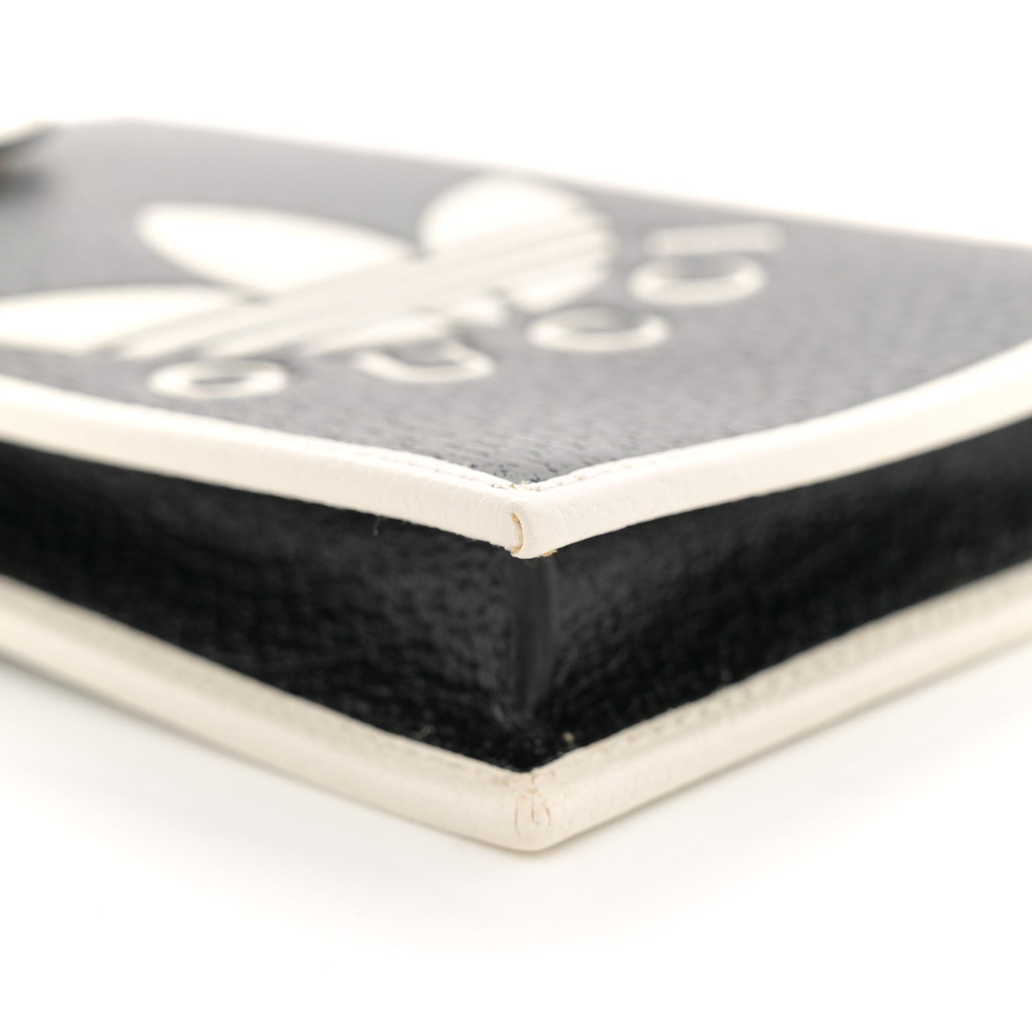 This is an authentic GUCCI X ADIDAS Textured Calfskin Trefoil Embossed Phone Crossbody Bag in Black and Off White. This phone pouch collab with Adidas is crafted of black calfskin leather with off-white leather trim and the classic Adidas trefoil and Gucci logo on the front. The pouch features an adjustable off-white leather crossbody strap and a crossover strap that unsnaps to a black suede interior with leather card slots.Follow this item for alerts. Gucci is a registered trademark of Gucci. FASHIONPHILE is not affiliated with Gucci.