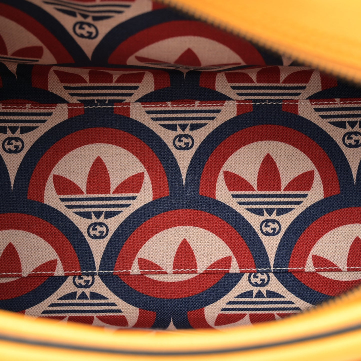 This is an authentic GUCCI X ADIDAS Textured Dollar Calfskin Web Trefoil Logo Embossed Mini Bowling Bag in Crop and Black. This stylish tote from the Gucci X Adidas collaboration is made of yellow calfskin leather and features the signature Adidas Trefoil. The handbag has rolled leather top handles, an optional web striped shoulder strap, and gold hardware. The top zipper opens to a trefoil printed fabric interior with a zippered pocket.Follow this item for alerts. Gucci is a registered trademark of Gucci. FASHIONPHILE is not affiliated with Gucci.