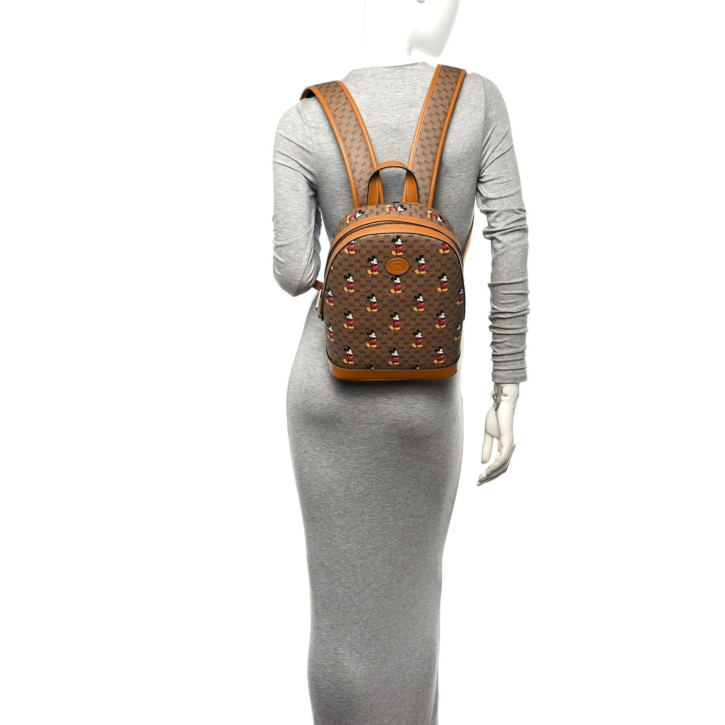 This is an authentic GUCCI X DISNEY Mini Vintage GG Supreme Monogram Mickey Mouse Small Dome Backpack in Beige and Vintage Sun Oil. This trendy backpack bag features Mickey Mouse, printed in full color on the classic GG print. This features adjustable shoulder straps and aged gold hardware, and light brown leather trim. The top zipper opens to a spacious beige fabric interior with zipper and patch pockets.Follow this item for alerts. Gucci is a registered trademark of Gucci. FASHIONPHILE is not affiliated with Gucci.