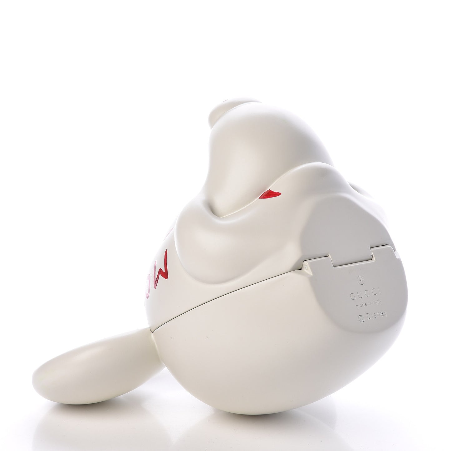 This is an authentic GUCCI Plastic Mickey Mouse Top Handle Bag in White. This clever top handle bag was designed for the Spring 2019 runway in honor of Mickey Mouse's 80th birthday in 2018. Created from a 3-D printer, this clutch bag features a top handle debossed with the Gucci name, red enameled details including a star and moon on the ears, a classic Mickey Mouse face, and the French phrase "mon petit chou", or "My Little Cream Puff" enameled across the forehead. The hidden magnet closure opens to a round sculpted plastic interior with two leather straps. Show off your individuality with this one of a kind statement bag, from Gucci!Follow this item for alerts. Gucci is a registered trademark of Gucci. FASHIONPHILE is not affiliated with Gucci.