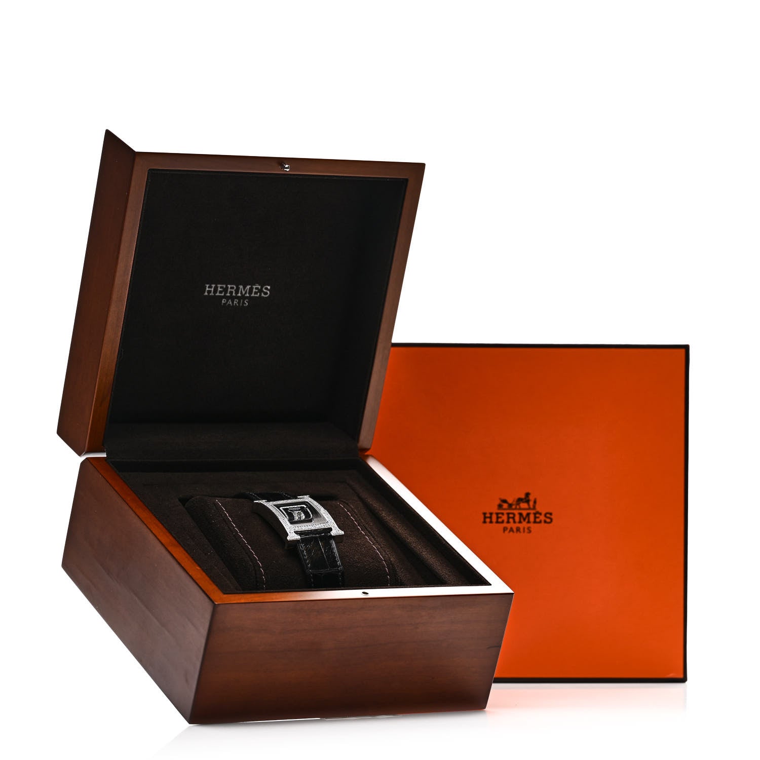 This is an authentic HERMES 18K White Gold Alligator Diamond Pave 26mm Heure H Hour Quartz Watch Noir. The watch is crafted of 18 karat white gold and features a diamond pave dial and bezel, black alligator strap, sapphire crystal, and a quartz movement.Follow this item for alerts. Hermes is a registered trademark of Hermes. FASHIONPHILE is not affiliated with Hermes.