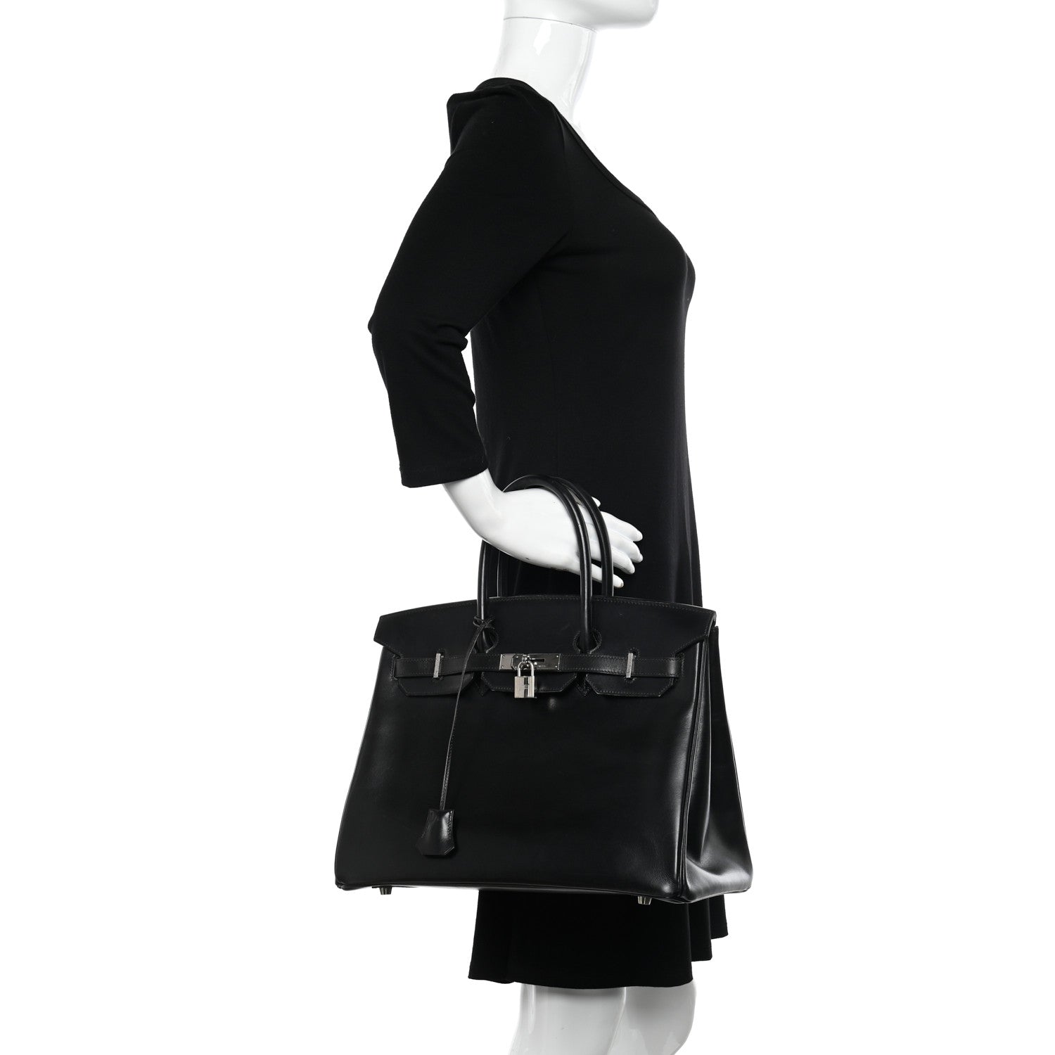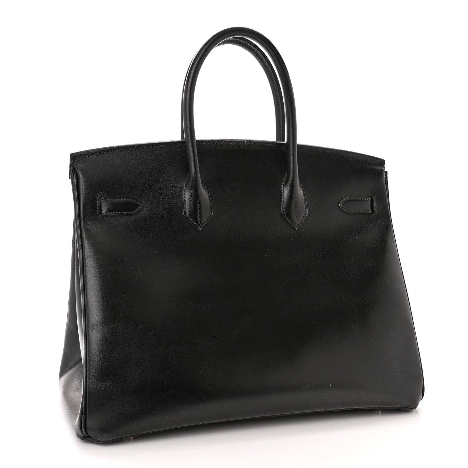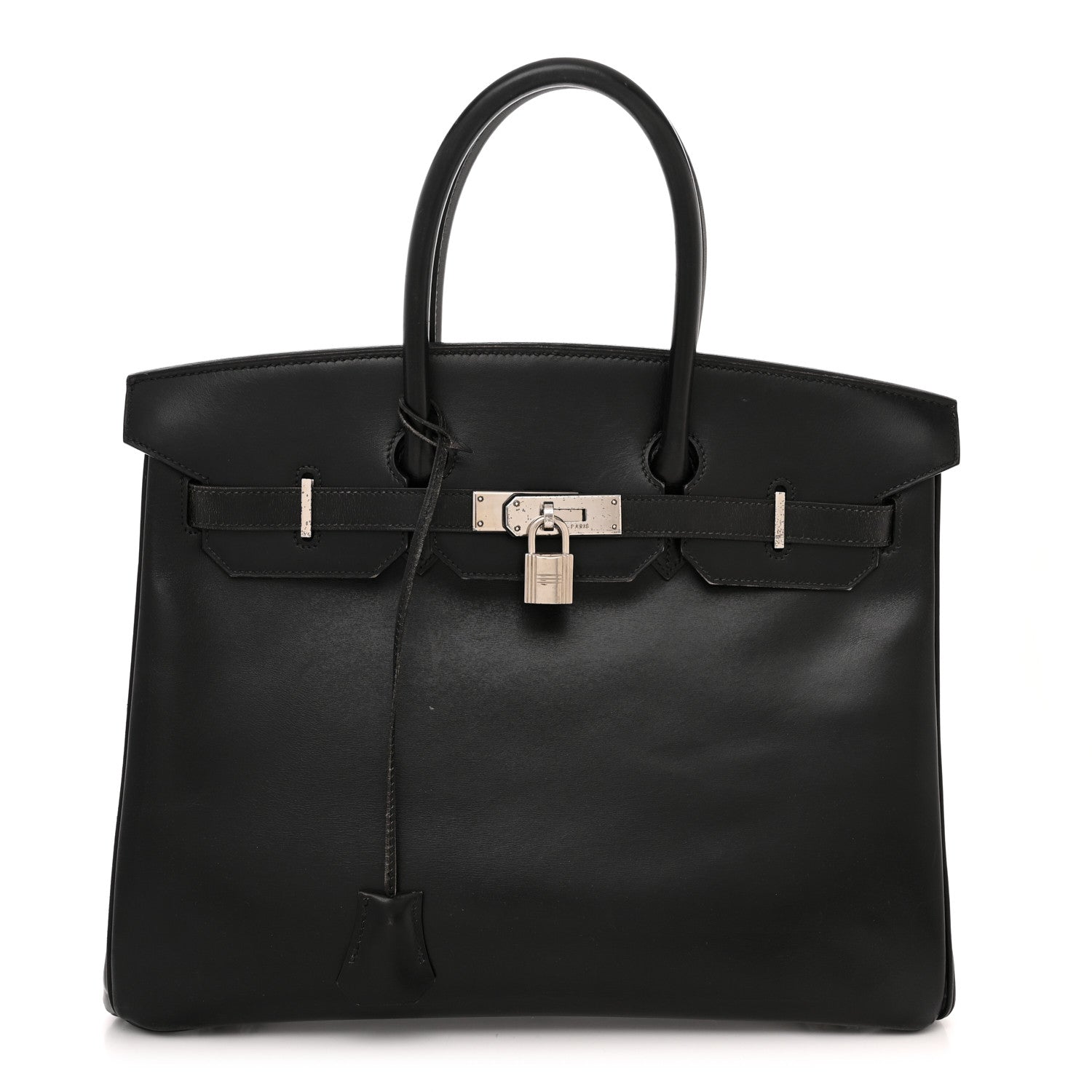 This is an authentic HERMES Box Birkin 35 in Black. This tote is crafted on smooth black leather and features rolled leather top handles, a front flap and strap closure with polished silver plated hardware including strap links and a front turn lock with a padlock and a matching clochette for the key. This opens the top flap to a matching leather interior with zipper and patch pockets.Follow this item for alerts. Hermes is a registered trademark of Hermes. FASHIONPHILE is not affiliated with Hermes.