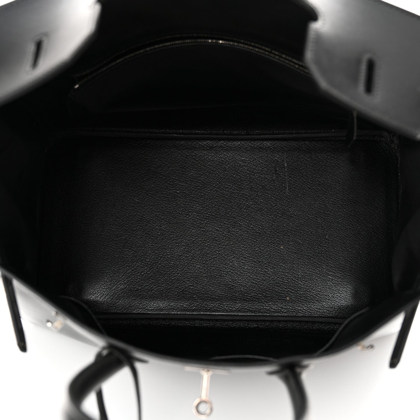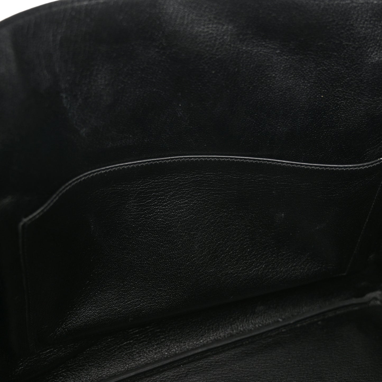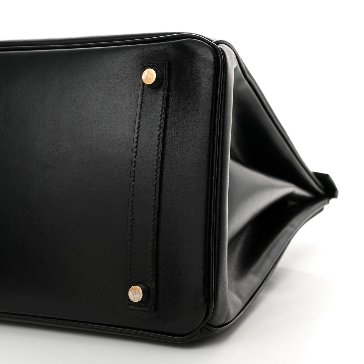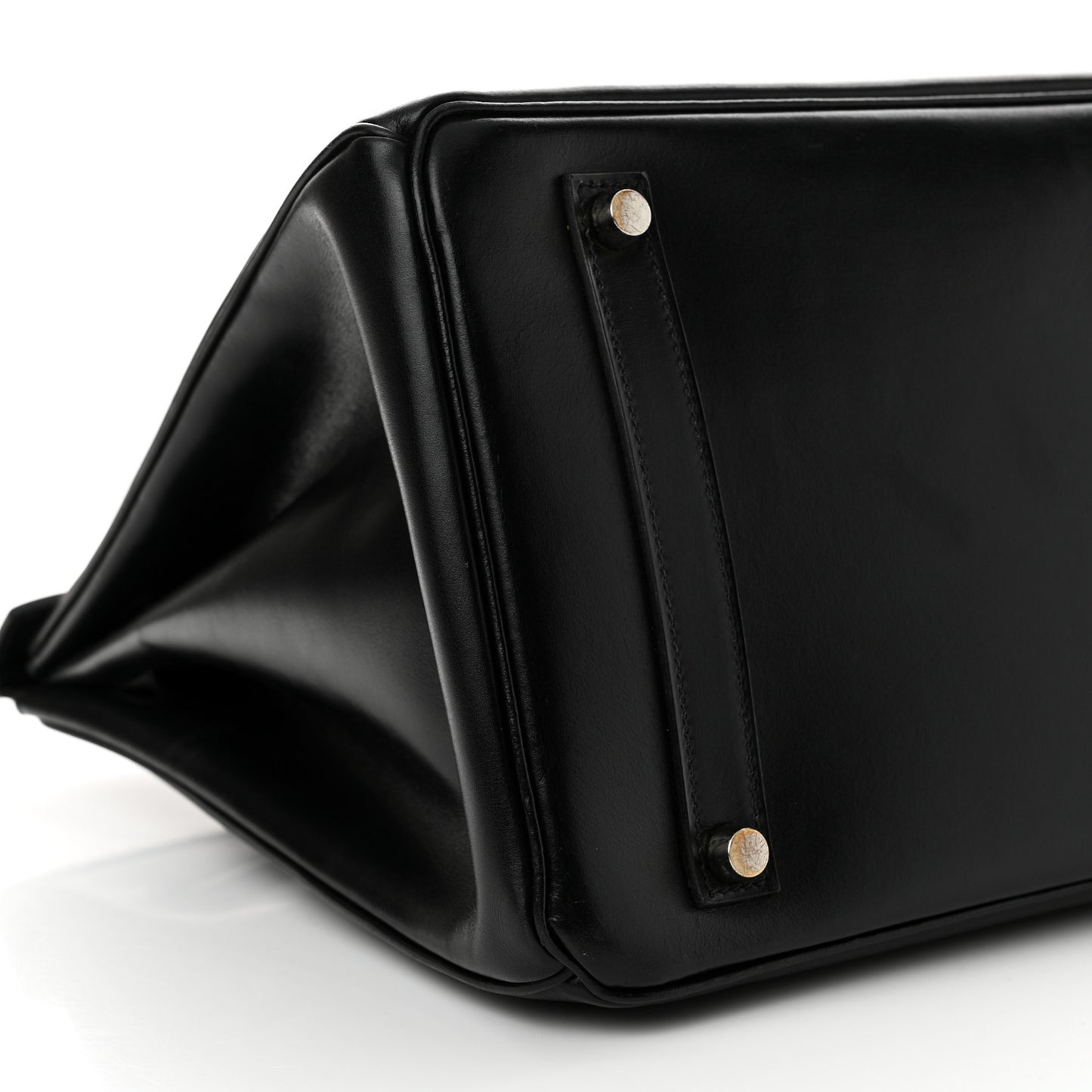 This is an authentic HERMES Box Birkin 35 in Black. This tote is crafted on smooth black leather and features rolled leather top handles, a front flap and strap closure with polished silver plated hardware including strap links and a front turn lock with a padlock and a matching clochette for the key. This opens the top flap to a matching leather interior with zipper and patch pockets.