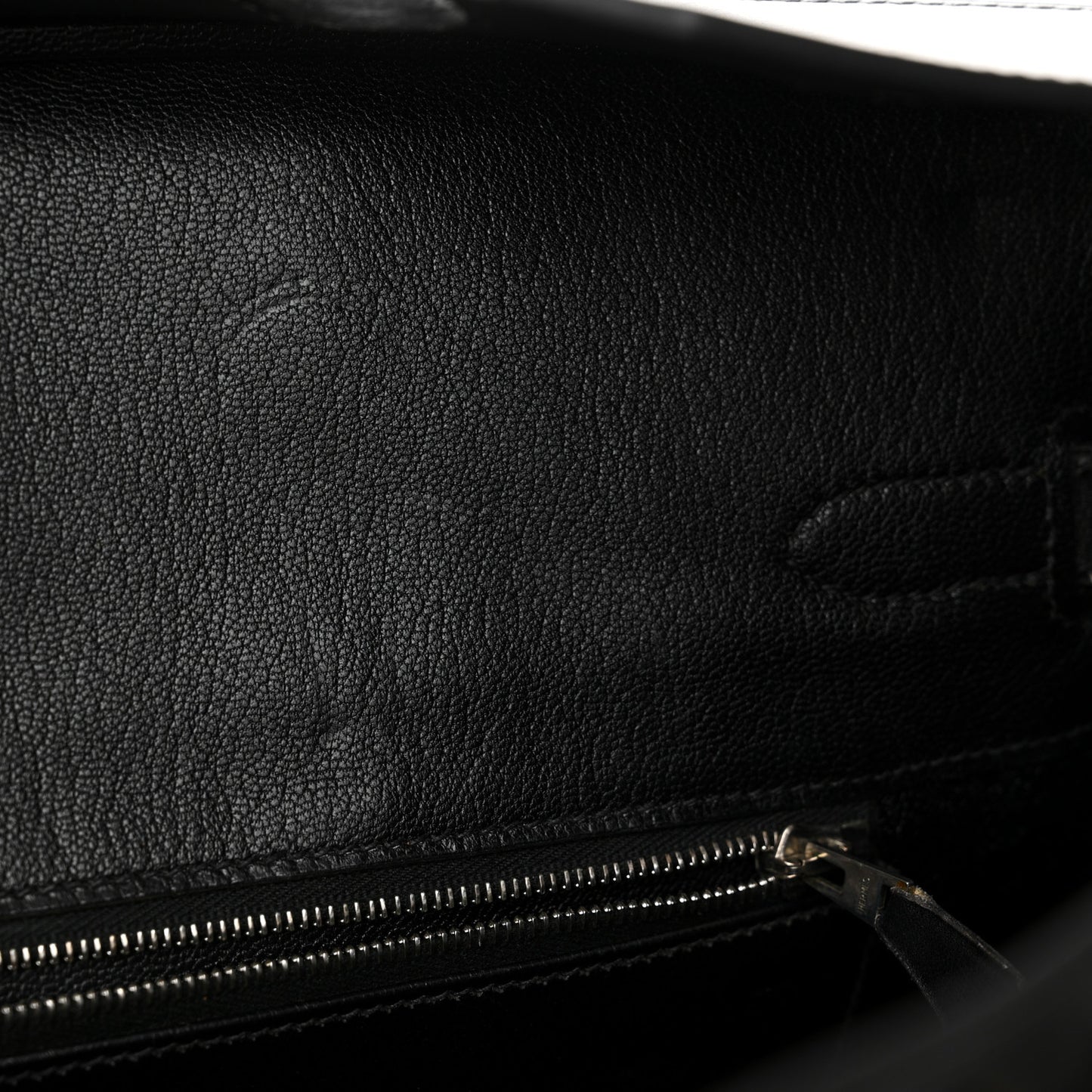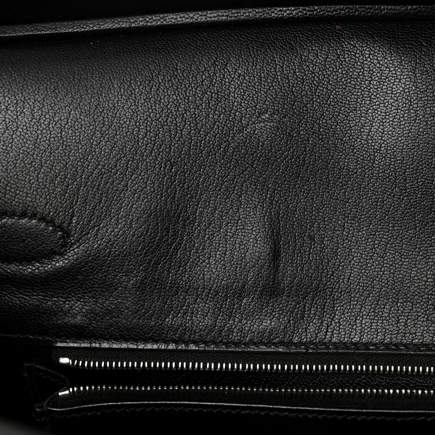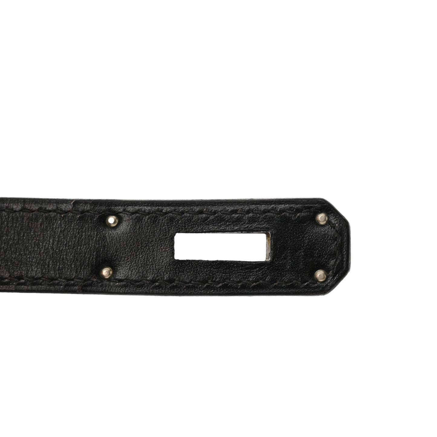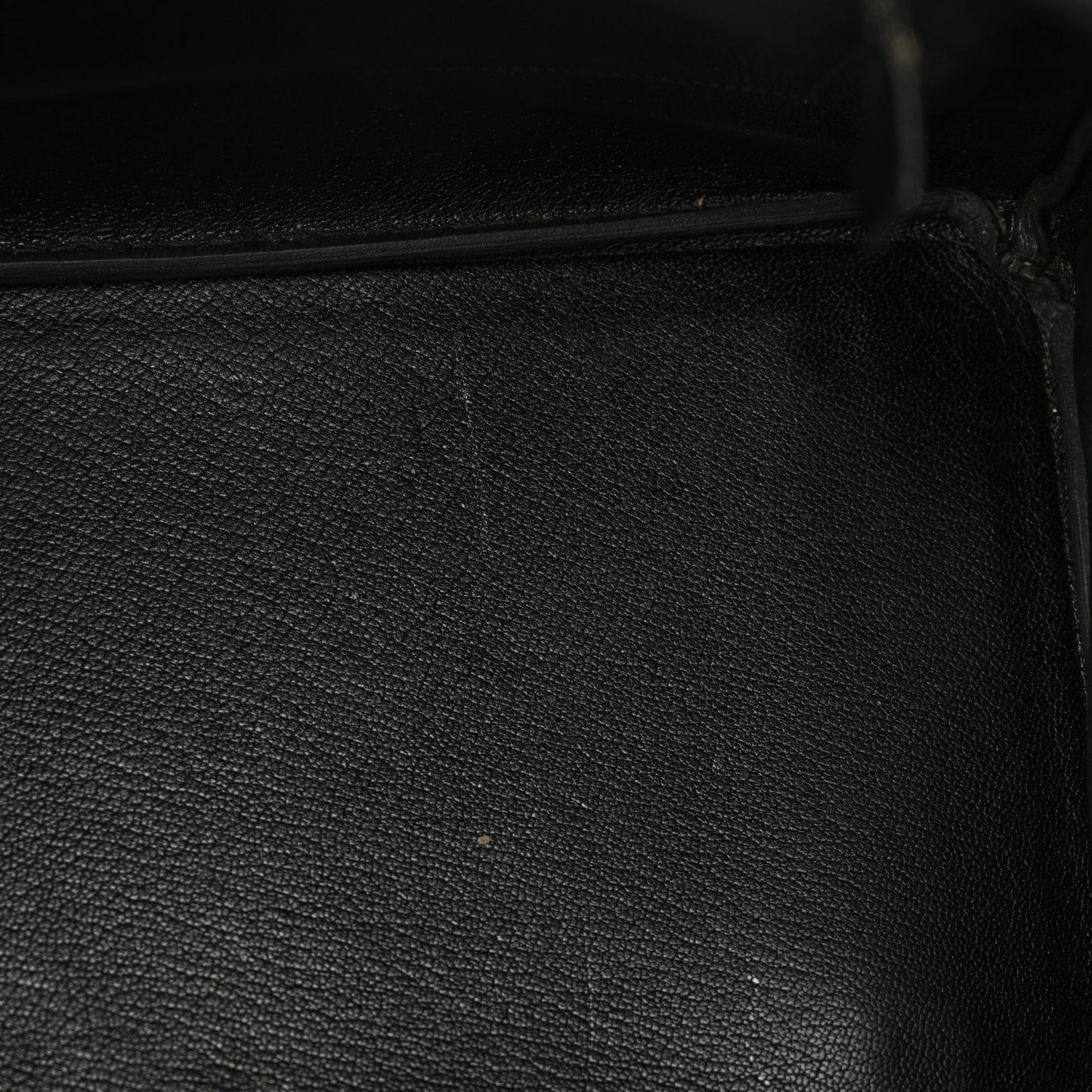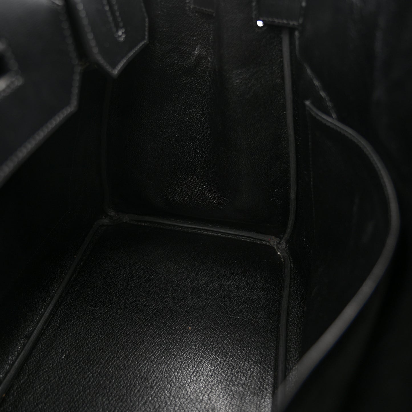 This is an authentic HERMES Box Birkin 35 in Black. This tote is crafted on smooth black leather and features rolled leather top handles, a front flap and strap closure with polished silver plated hardware including strap links and a front turn lock with a padlock and a matching clochette for the key. This opens the top flap to a matching leather interior with zipper and patch pockets.