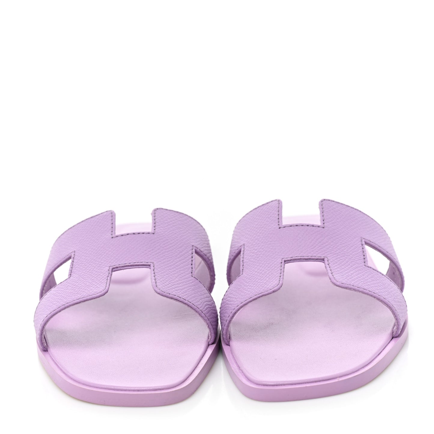 This is an authentic pair of HERMES Epsom Oran Sandals size 36 in Amethyst. These stylish slippers are crafted of epsom calfskin leather in light purple. They feature a cross toe strap of a large Hermes H.