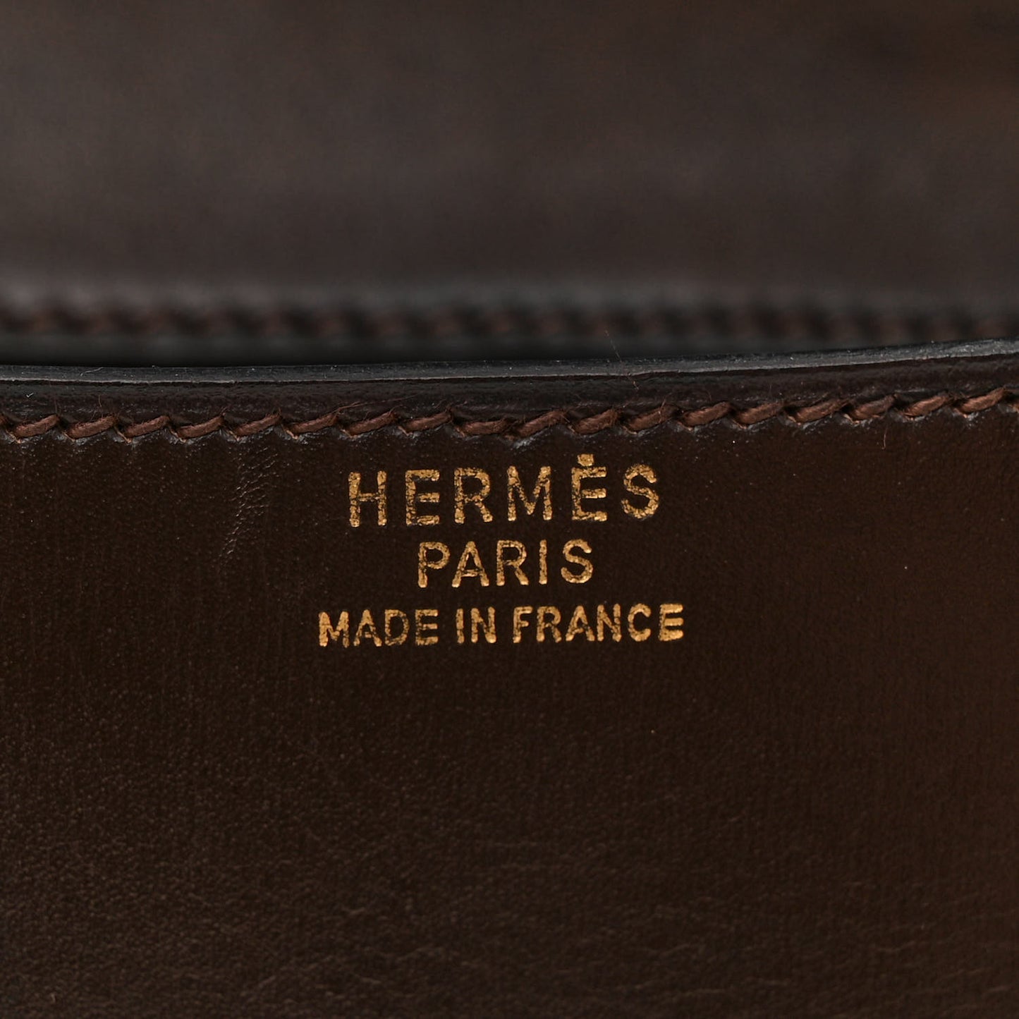 This is an authentic HERMES Box Constance 23 in Chocolate. This stylish shoulder bag is finely crafted of calfskin leather in dark brown. The bag features a cross body strap with gold hardware including a gold plated H buckle at the frontal flap. The flap opens to a compact leather interior with zipper and patch pockets.Follow this item for alerts. Hermes is a registered trademark of Hermes. FASHIONPHILE is not affiliated with Hermes.
