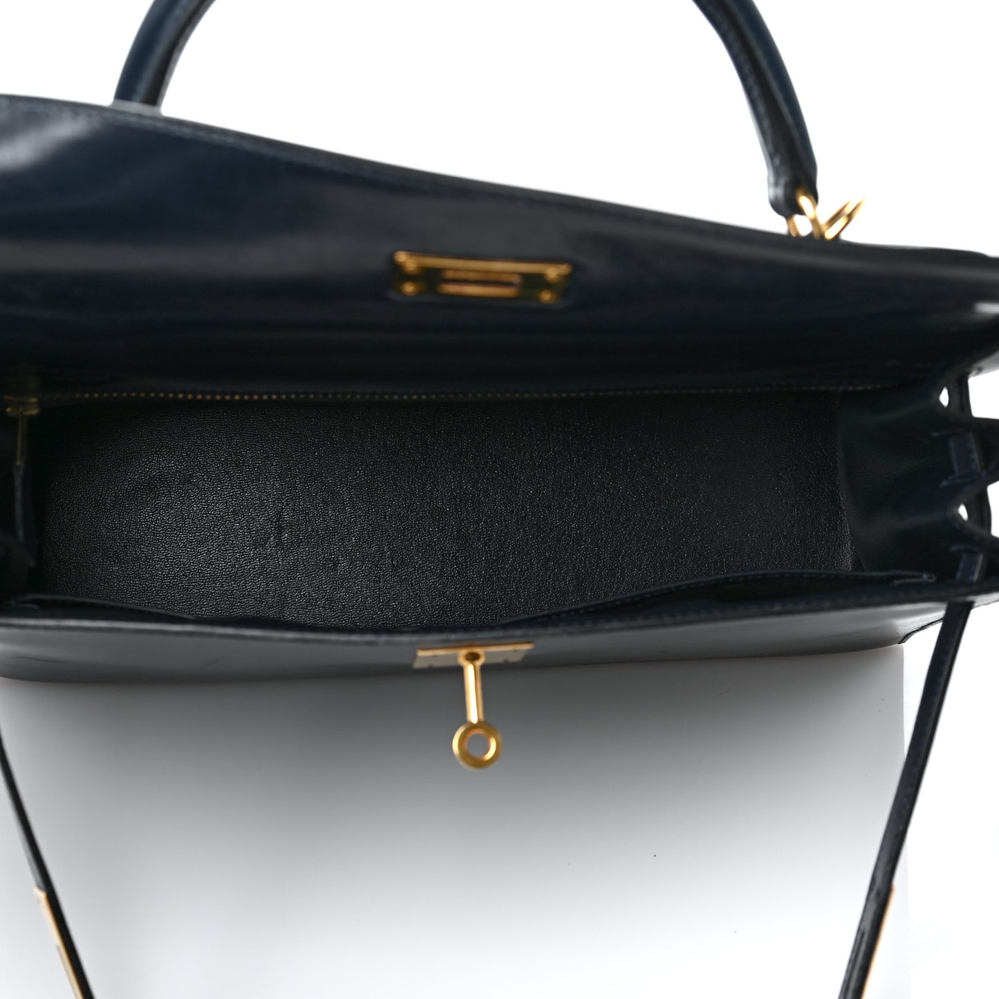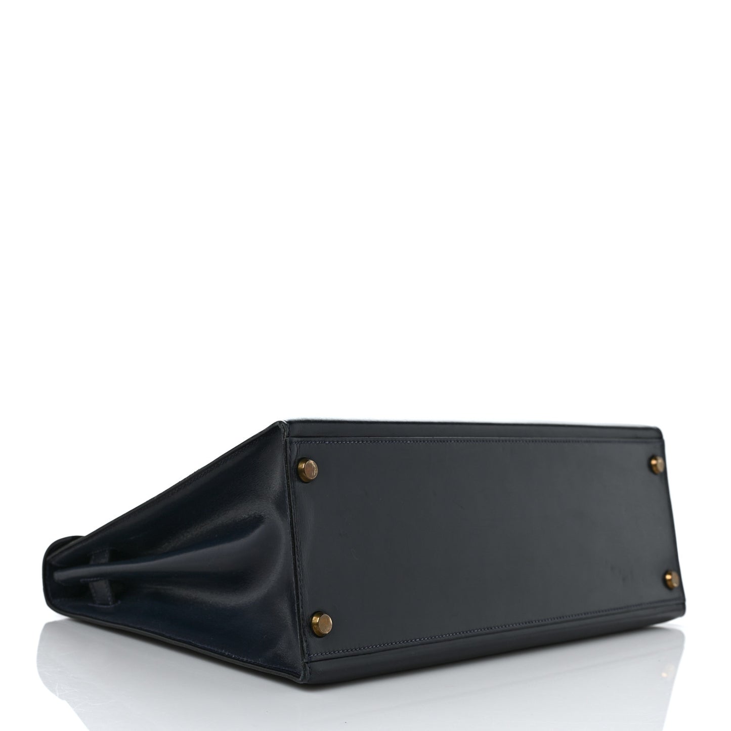 This is the authentic HERMES Box Kelly Sellier 32 in Bleu Marine. This stylish tote is crafted of beautifully smooth box calfskin leather in dark blue. The handbag features a reinforced leather top handle with polished gold plated links, a cross over flap and strap closure with a signature Kelly gold plated turn lock, a padlock and keys. The top opens to a matching leather interior with zipper and patch pockets.Follow this item for alerts. Hermes is a registered trademark of Hermes. FASHIONPHILE is not affiliated with Hermes.