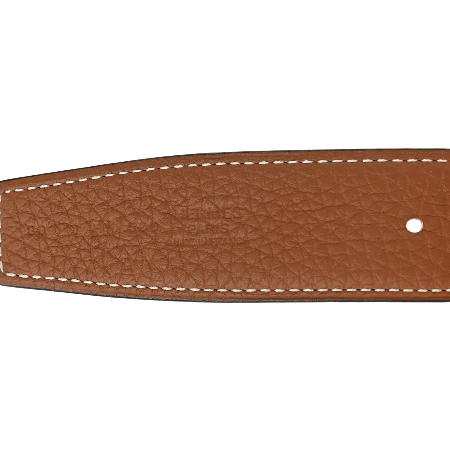 This is an authentic HERMES Box Togo 32mm H Belt size 80 in Black and Gold. This stylish reversible belt is crafted of Togo leather in light brown, with smooth black leather on the reverse and a brushed silver Hermes H buckle.