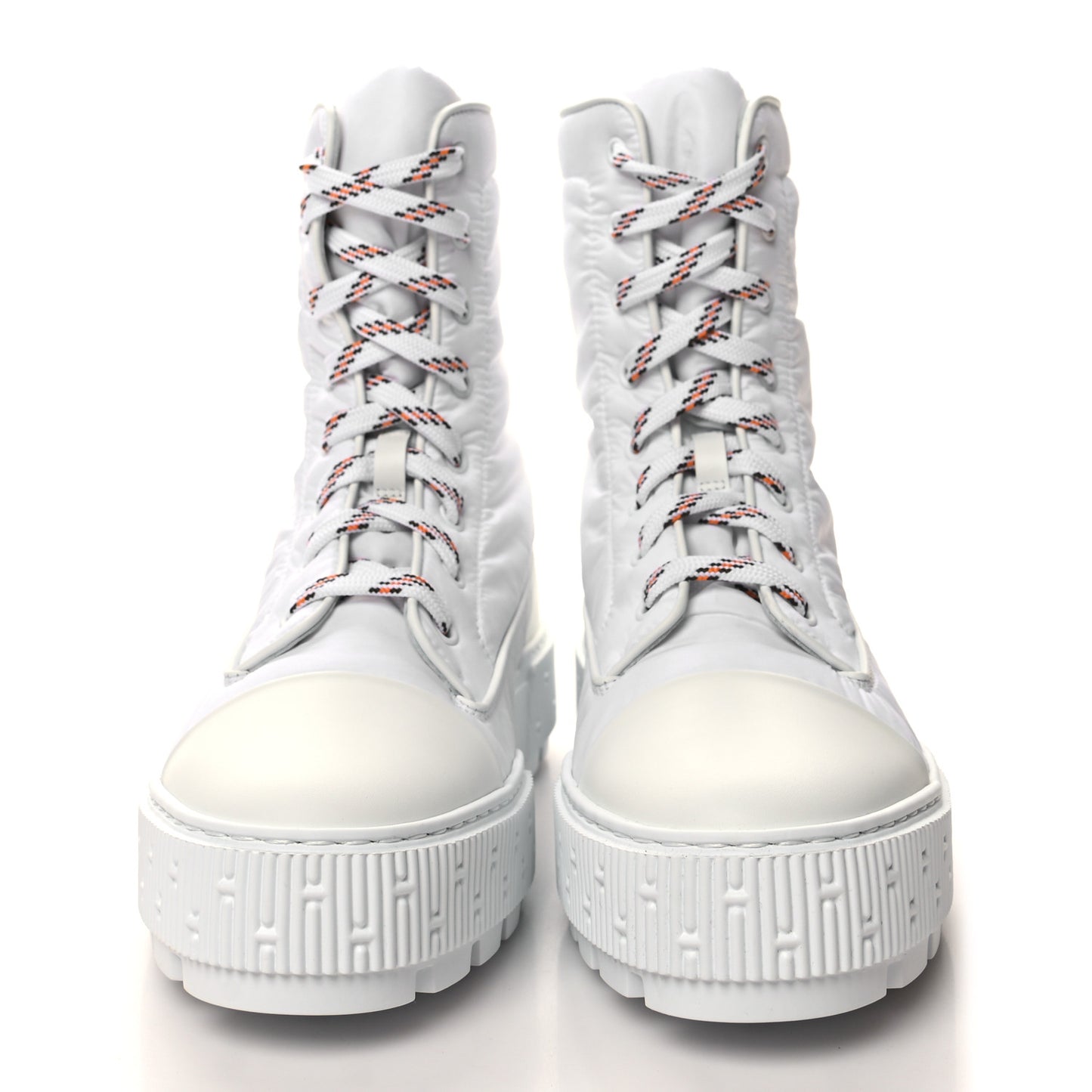 This is an authentic pair of HERMES Calfskin Parachute Fresh Ankle Boots size 39 in White. These ankle boots are crafted of fine nylon parachute fabric. They feature a rubber toe and thick rubber sole.