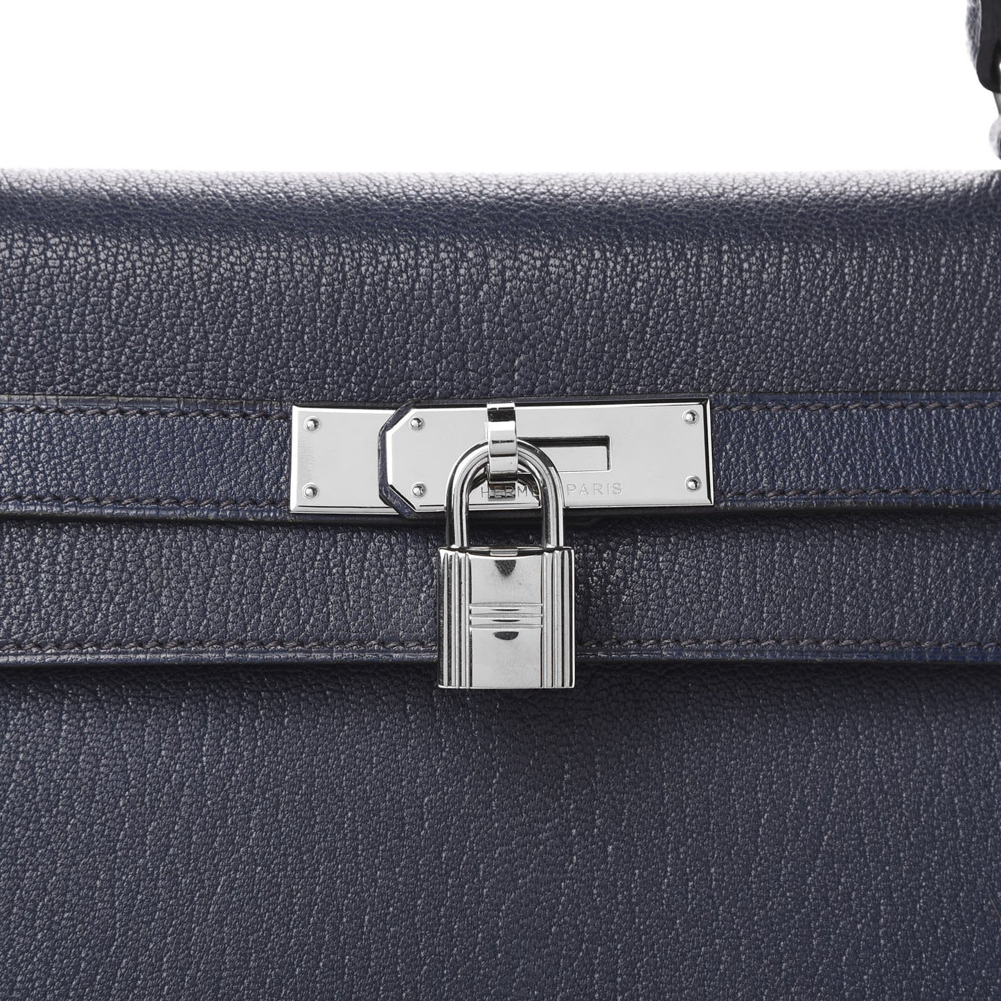 This is an authentic HERMES Chevre de Coromandel Sellier Kelly 35 in Bleu Thalassa. This stunning Kelly tote is crafted of beautifully textured goatskin leather in dark blue. The bag features a rolled leather top handle with polished palladium links and an optional leather shoulder strap. The bag features a strap closure and a signature Kelly turn lock and padlock with a hanging clochette for the keys. This opens the bag to a matte leather interior with a zipper and patched pocket. This is an exquisite tote for every occasion with the classic sophistication only from Hermes!Follow this item for alerts. Hermes is a registered trademark of Hermes. FASHIONPHILE is not affiliated with Hermes.