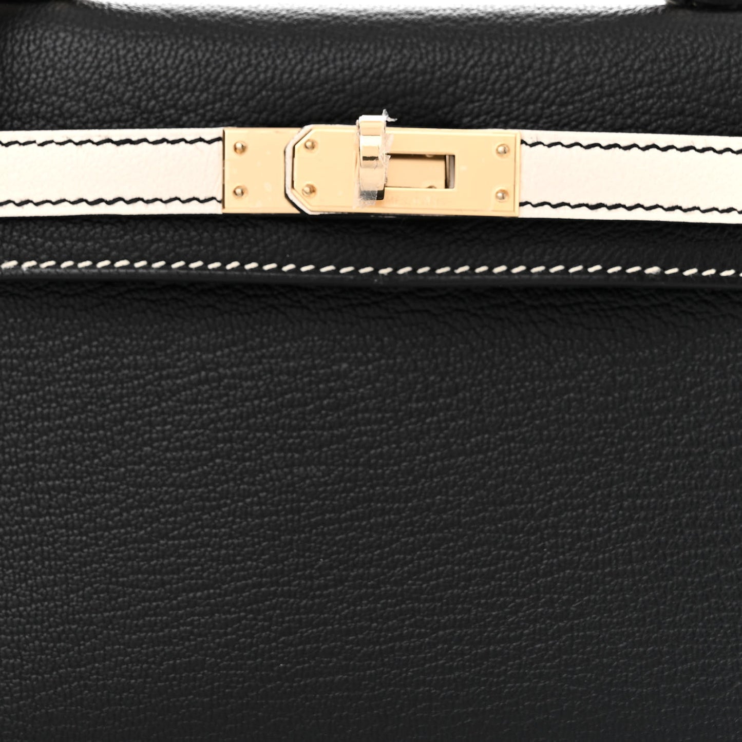 This is an authentic HERMES Chevre Mysore Horseshoe Mini Kelly Sellier 20 in Black and Craie. This iconic mini Kelly bag is finely crafted of black goatskin leather with classic Kelly features including the iconic structured shape complemented by a small top flap and straps with a gold turn lock. The flap opens to a black leather interior with a flat pocket.Follow this item for alerts. Hermes is a registered trademark of Hermes. FASHIONPHILE is not affiliated with Hermes.