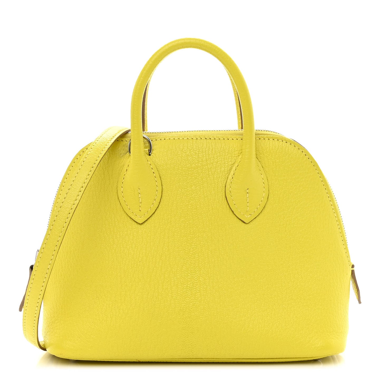 This is an authentic HERMES Chevre Mysore Mini 1923 Bolide in Lime. This stylish tote is crafted of supple goatskin leather in highlighter yellow. This mini handbag features rolled leather top handles, an optional leather shoulder strap and silver hardware. The top zipper opens to a matching leather interior with a patch pocket.
