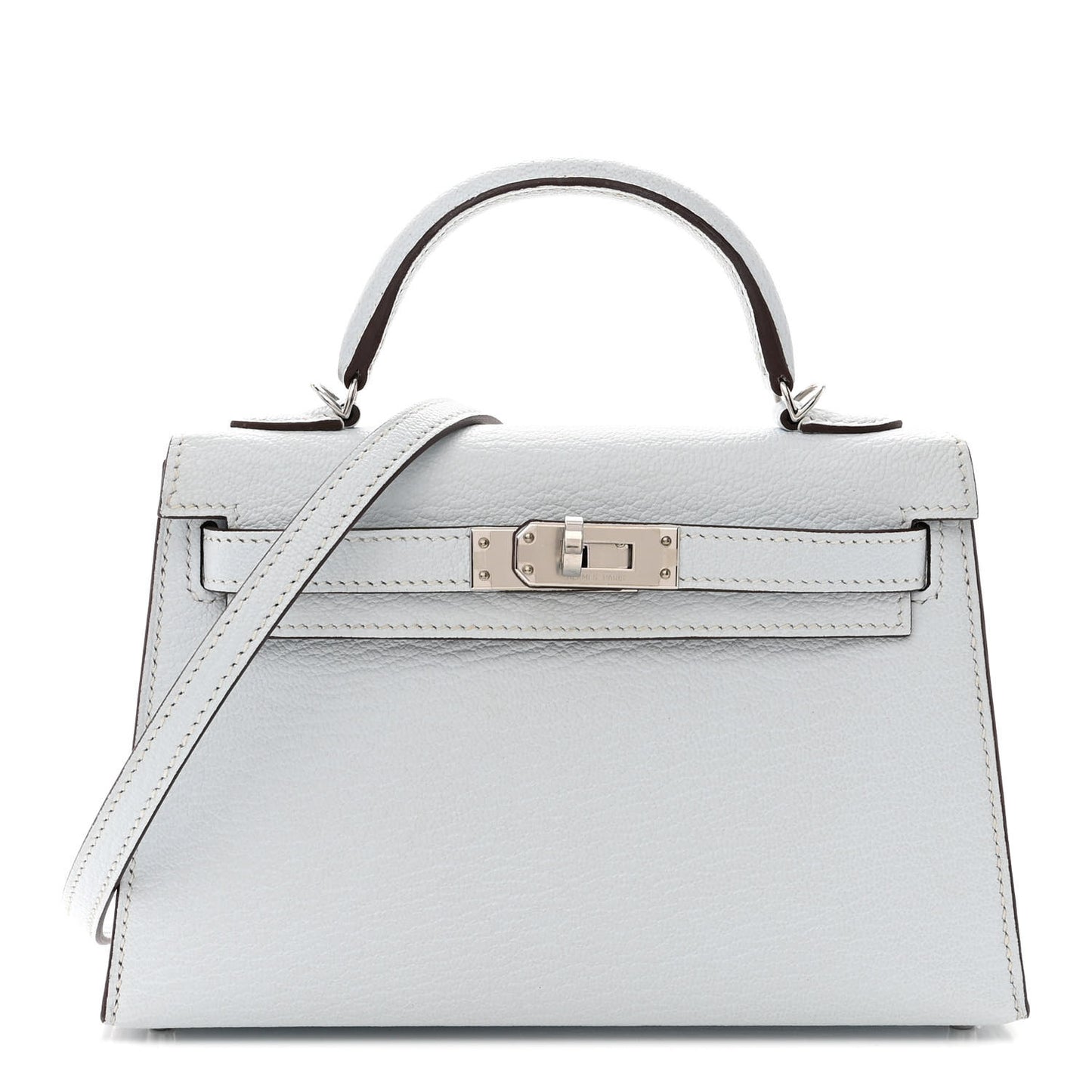 This is an authentic HERMES Chevre Mysore Mini Kelly Sellier 20 in Bleu Brume. This stunning Hermes classic handbag is beautifully crafted in goatskin leather in light blue. A single rolled leather top handle is secured with palladium-plated hardware and an optional leather shoulder strap is included. The traditional Kelly turn lock secures the small flap. The interior features a matching chevre goatskin leather with a single flat pocket.Follow this item for alerts. Hermes is a registered trademark of Hermes. FASHIONPHILE is not affiliated with Hermes.