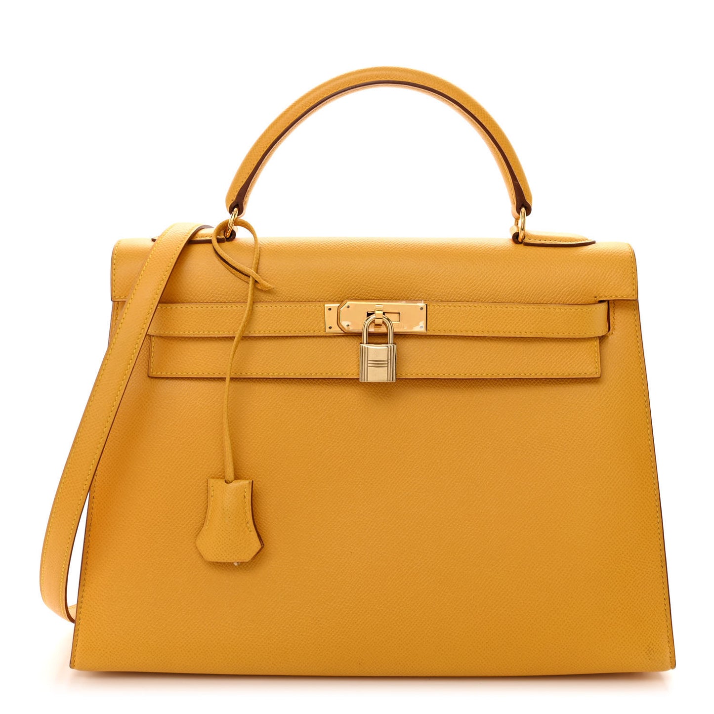 This is an authentic HERMES Courchevel Kelly Sellier 32 in Jaune. This structured handbag is crafted of stamped and textured calfskin leather in dark yellow. The bag features a single leather top handle with polished gold plated links, an optional shoulder strap with gold toned clasps, and a signature Kelly turn lock and padlock with a clochette for the keys. The short flap opens to a spacious and durable matte leather interior with zippered and flat pockets.Follow this item for alerts. Hermes is a registered trademark of Hermes. FASHIONPHILE is not affiliated with Hermes.