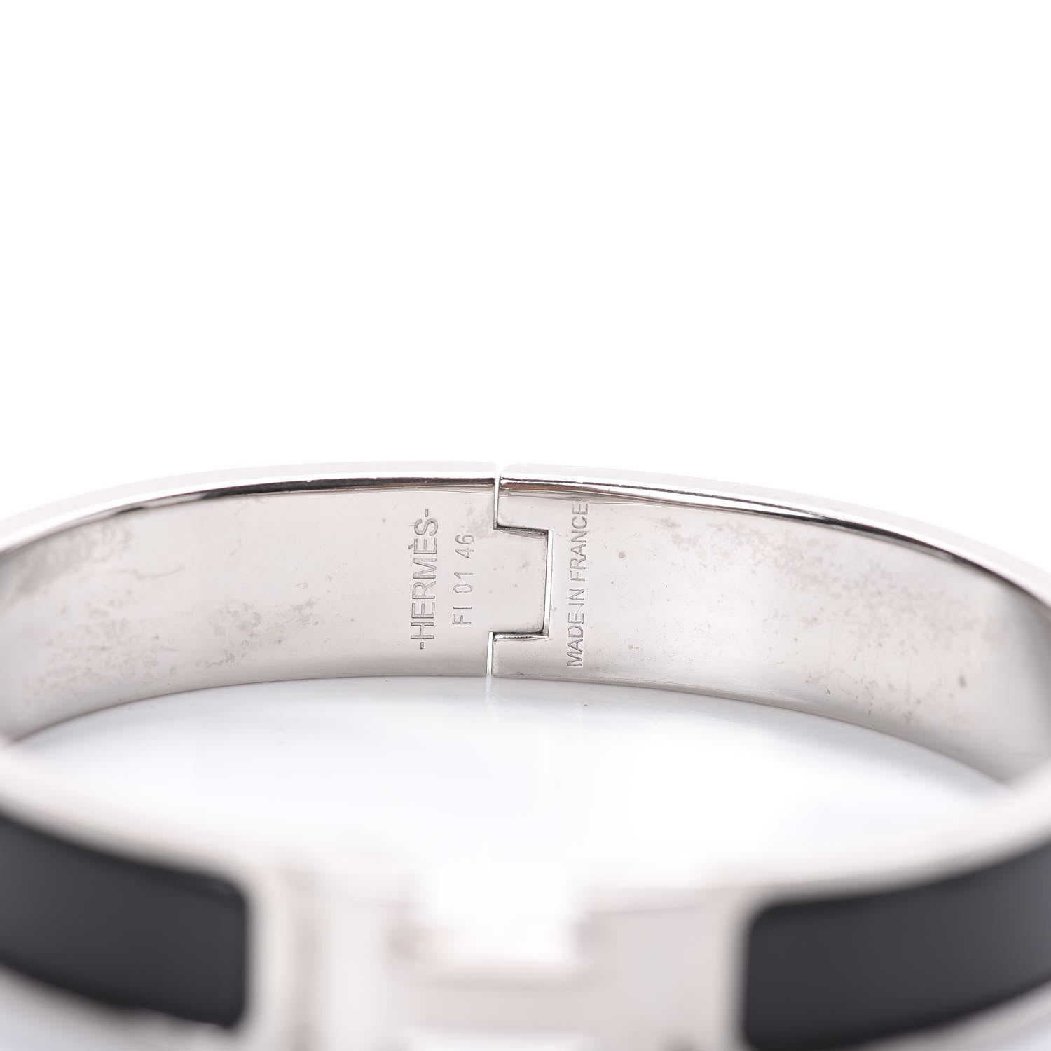 This is an authentic HERMES Enamel Narrow Clic Clac H Bracelet GM in Black. This chic bracelet has a palladium silver band with a black enamel inlay and features a palladium "H" swivel closure. Wear this bracelet to add sophistication to any look, with the classic style only from Hermes!Follow this item for alerts. Hermes is a registered trademark of Hermes. FASHIONPHILE is not affiliated with Hermes.