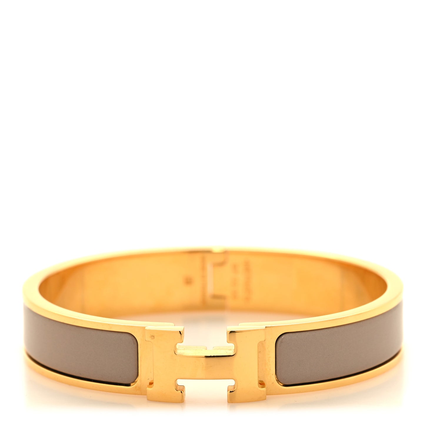 This is an authentic HERMES Enamel Narrow Clic Clac H Bracelet GM in Marron Glace. This is a chic bracelet that features a gold plated band with a hinge on one side and opens with a matching swivel Hermes "H" on the prominent side. Around the band is a strip of pink enamel.Follow this item for alerts. Hermes is a registered trademark of Hermes. FASHIONPHILE is not affiliated with Hermes.