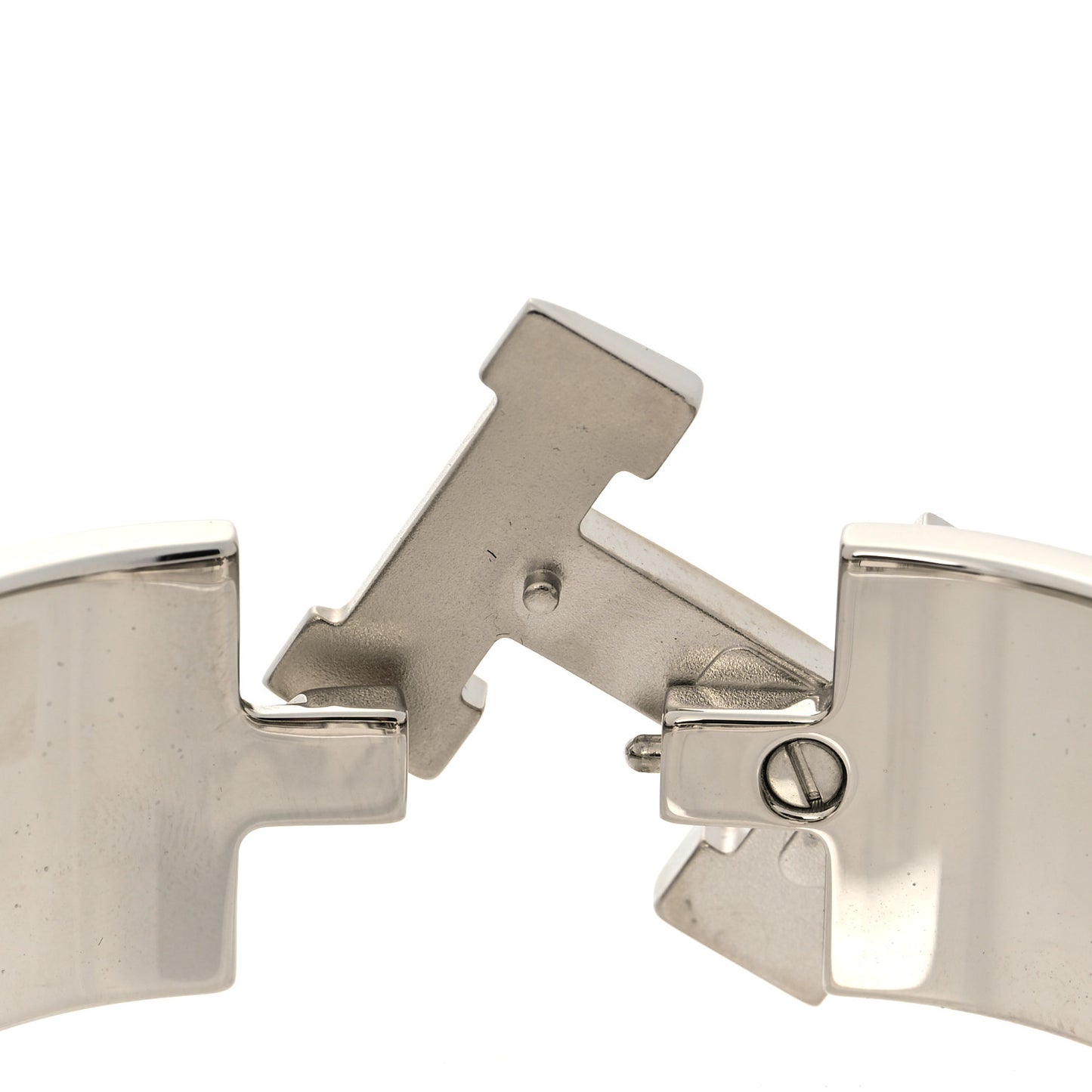 This is an authentic HERMES Enamel Wide Clic Clac H Bracelet PM in Bleu Orage. This is a chic bracelet from Hermes that is classic yet modern. It is a polished silver palladium band with a hinge on one side that opens with a swivel Hermes "H" on the prominent side. Around the band is a strip of white enamel.Follow this item for alerts. Hermes is a registered trademark of Hermes. FASHIONPHILE is not affiliated with Hermes.