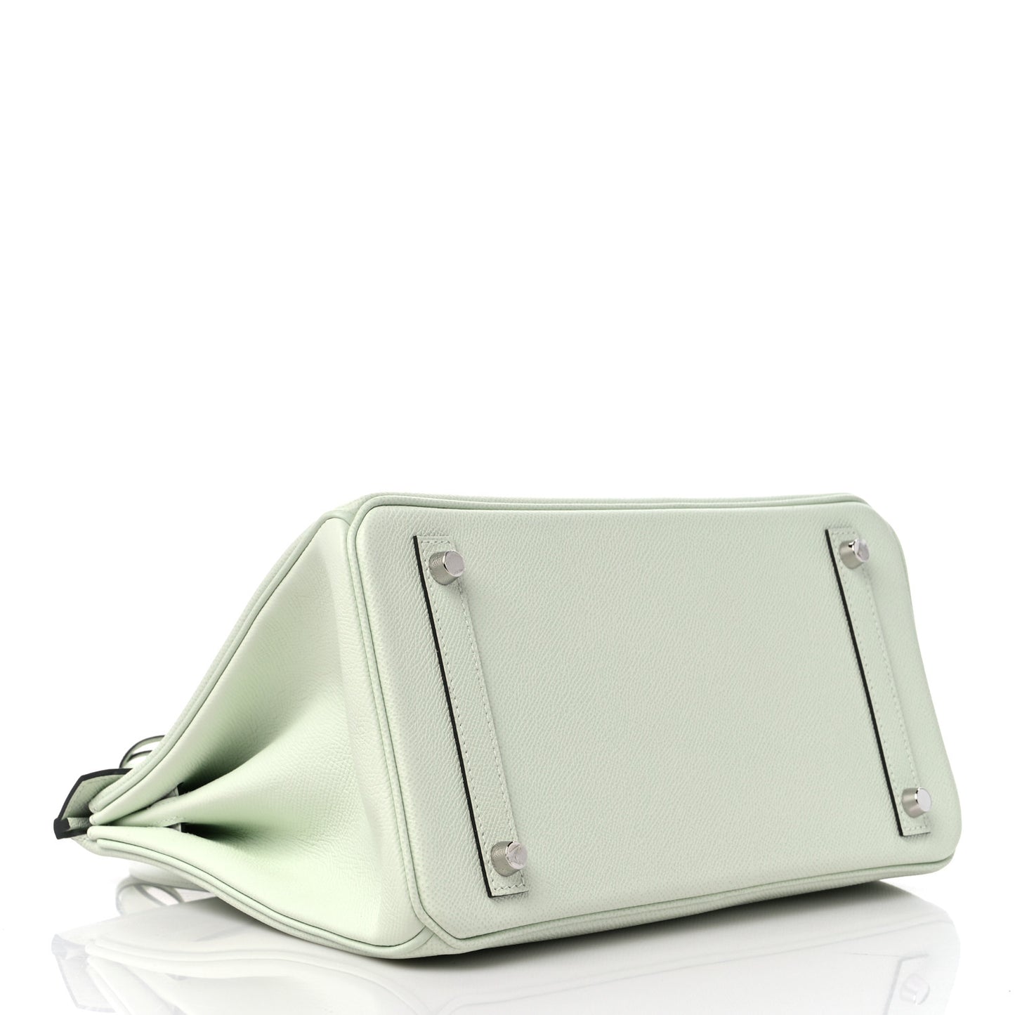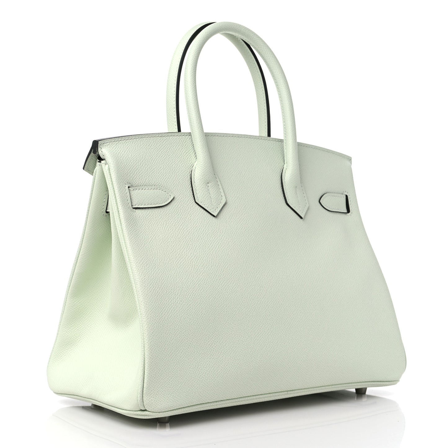 This is an authentic HERMES Epsom Birkin 30 in Gris Neve. This classic handbag is crafted of textured leather in light green. It features rolled leather top handles, a flap with strap closure, and silver plated hardware. The flap opens to a matching leather interior with zipper and pockets.