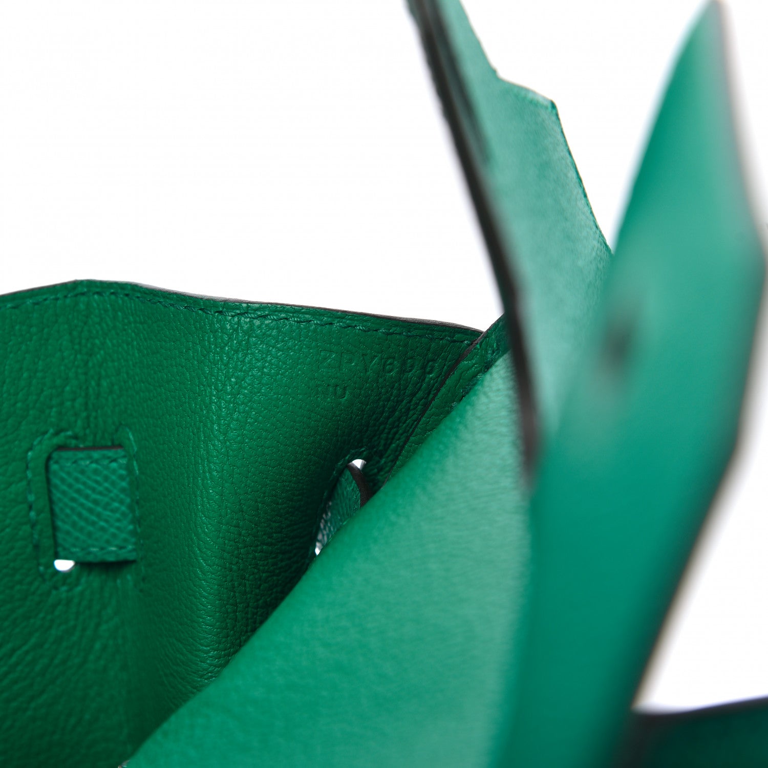 This is an authentic HERMES Epsom Birkin 30 in Vert Jade. This stylish Birkin handbag is crafted of luxurious calfskin stamped leather in green. This bag features rolled leather top handles, a hanging clochette, a cross over flap with strap closure and a polished silver palladium plated turn lock and hardware. This opens to a matching matte leather interior with zipper and patch pockets.Follow this item for alerts. Hermes is a registered trademark of Hermes. FASHIONPHILE is not affiliated with Hermes.