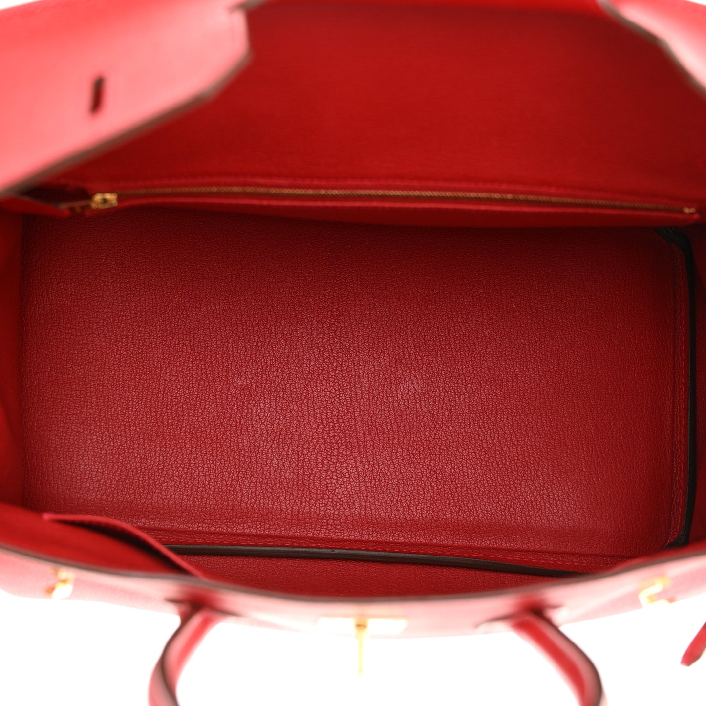 This is an authentic HERMES Epsom Birkin 35 in Rouge Casaque. This stylish tote is beautifully crafted of epsom calfskin leather in red. This bag features rolled leather top handles, polished gold hardware, and a frontal flap and strap closure. This opens to a red chevre leather interior with a zipper pocket and patch pockets.Follow this item for alerts. Hermes is a registered trademark of Hermes. FASHIONPHILE is not affiliated with Hermes.