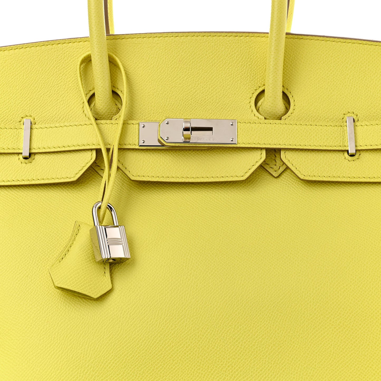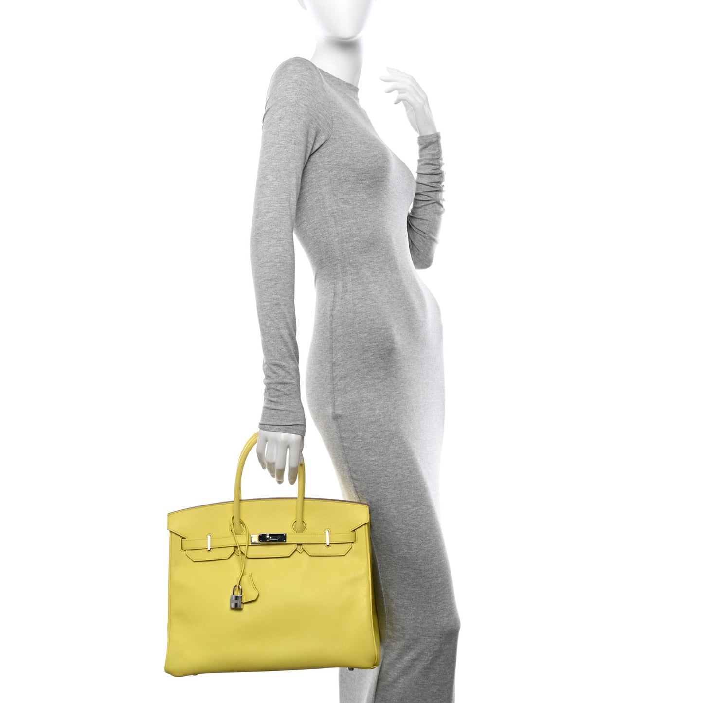 This is an authentic HERMES Epsom Birkin 35 in Soufre. This Birkin handbag tote is crafted of durable epsom calfskin leather in bright yellow. The bag features rolled leather top handles, a cross-over flap, and a leather strap closure with palladium gold hardware including a turn lock and a hanging clochette with keys to the padlock. This opens to a matte chevre goatskin leather interior with zipper and patch pockets.Follow this item for alerts. Hermes is a registered trademark of Hermes. FASHIONPHILE is not affiliated with Hermes.