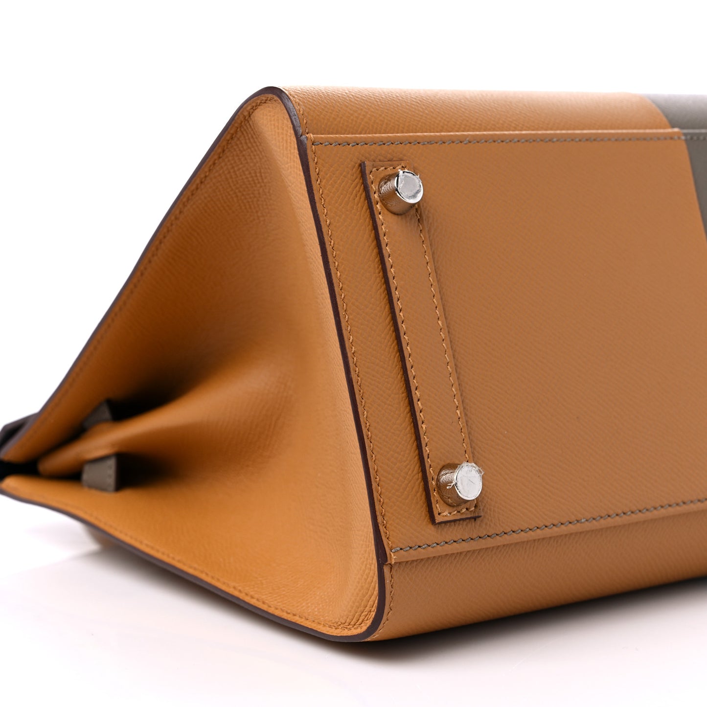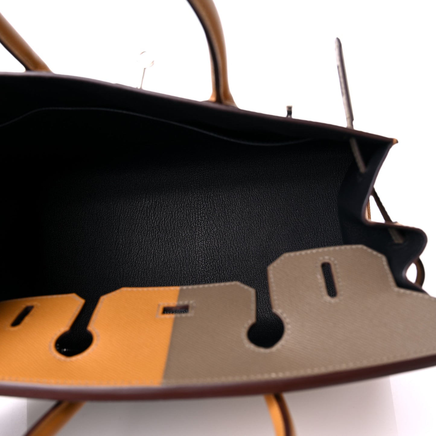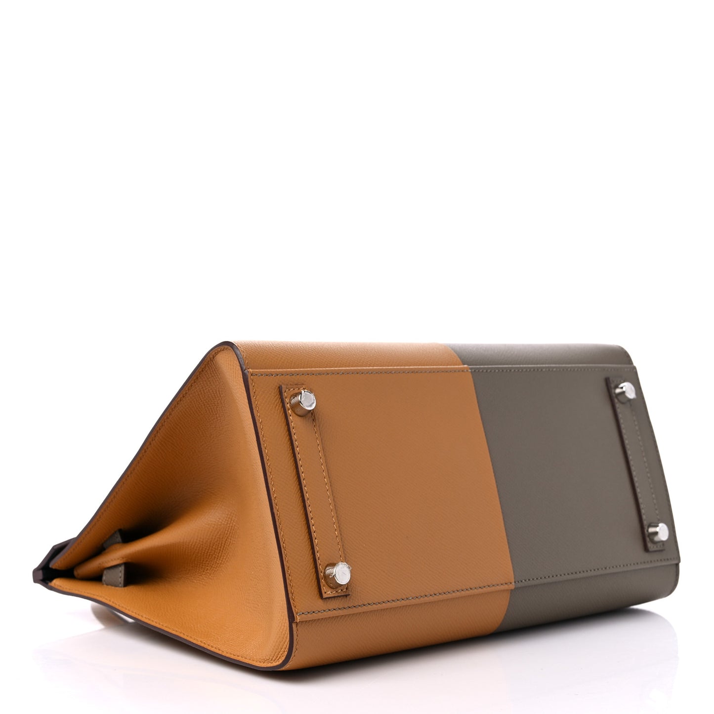This is an authentic HERMES Epsom Casaque Birkin Sellier 30 in Etoupe, Sesame and Bleu Indigo. This rare Sellier model is expertly constructed of finely grained epsom calfskin leather in taupe and dark yellow. This bag features rolled leather top handles, a front flap and strap closure and polished silver plated hardware including a silver plated turn lock, a padlock and clochette for keys. This opens to a blue goatskin leather interior with zipper and patch pockets.Follow this item for alerts. Hermes is a registered trademark of Hermes. FASHIONPHILE is not affiliated with Hermes.