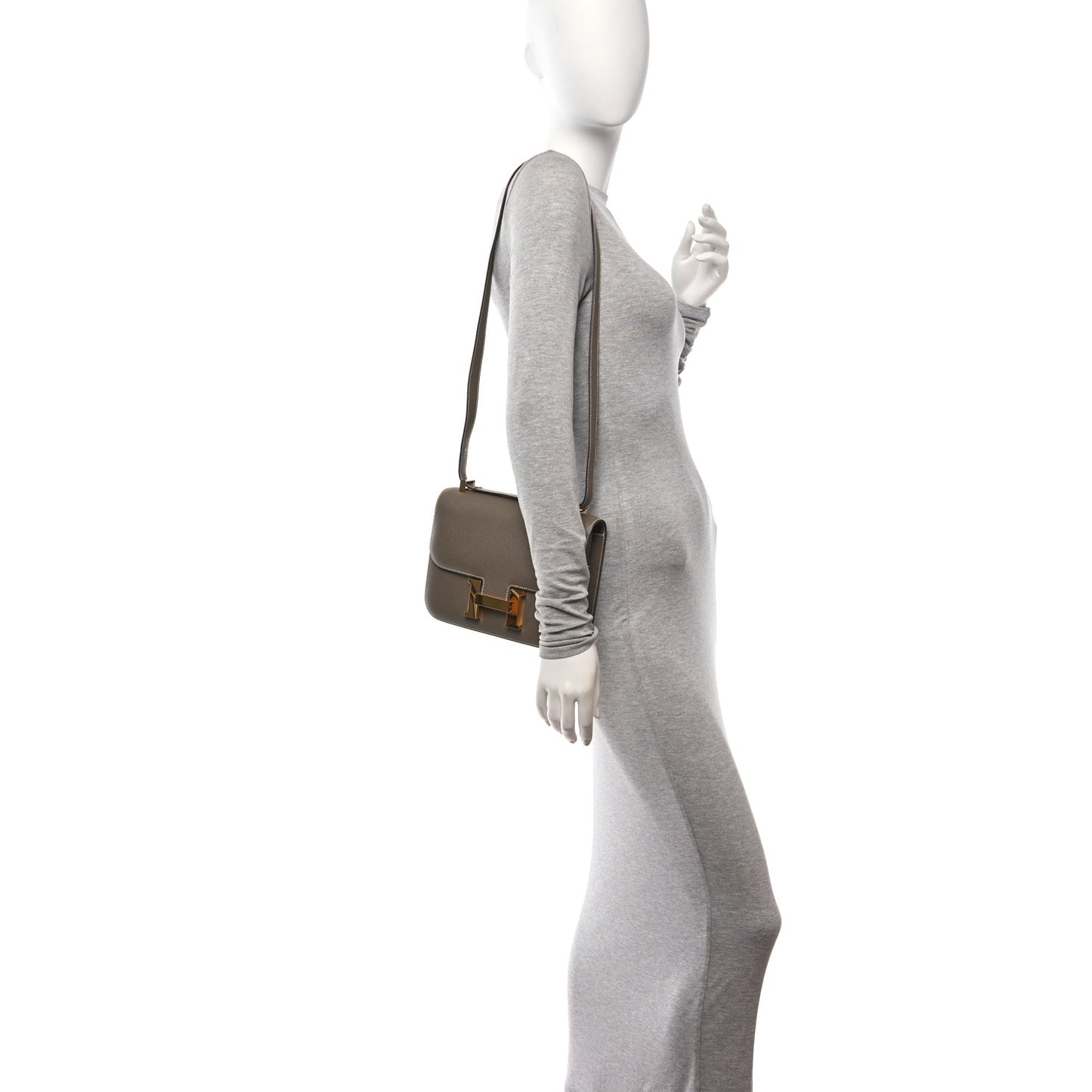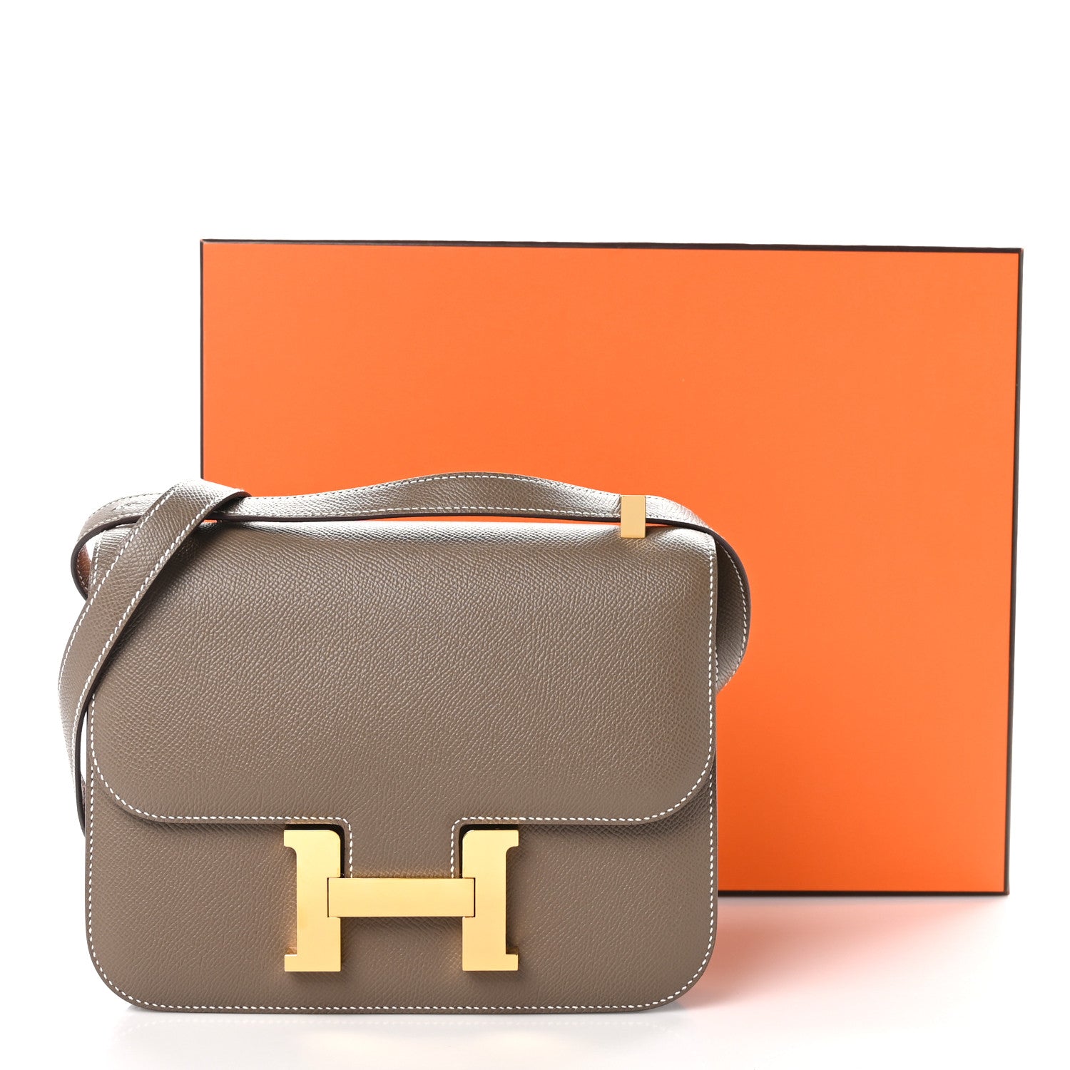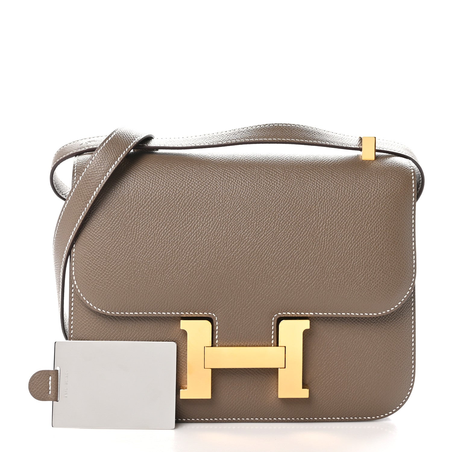 This is an authentic HERMES Epsom Constance 1-24 in Etoupe. This stylish shoulder bag is crafted of epsom calfskin leather in taupe. The bag features a rear slip pocket, a long shoulder strap with gold plated hardware, and a gold H buckle on the front. This opens the flap to a smooth beige leather interior with zippered and flat pockets and a removable mirror.Follow this item for alerts. Hermes is a registered trademark of Hermes. FASHIONPHILE is not affiliated with Hermes.