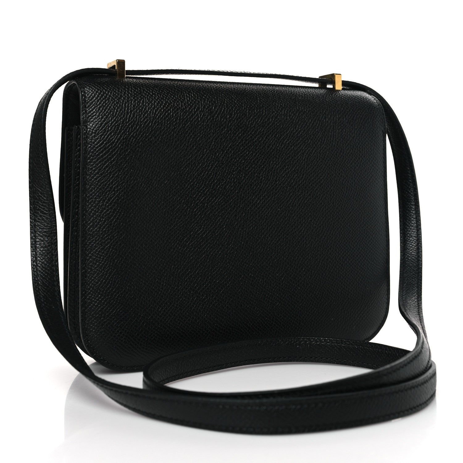 This is an authentic HERMES Epsom Constance 18 in Black. This stylish shoulder bag is finely crafted of Epsom calfskin leather in black. The bag features a crossbody strap with gold hardware including an H buckle at the front flap. The flap opens to a compact partitioned black leather interior with a flat and zippered pocket.Follow this item for alerts. Hermes is a registered trademark of Hermes. FASHIONPHILE is not affiliated with Hermes.