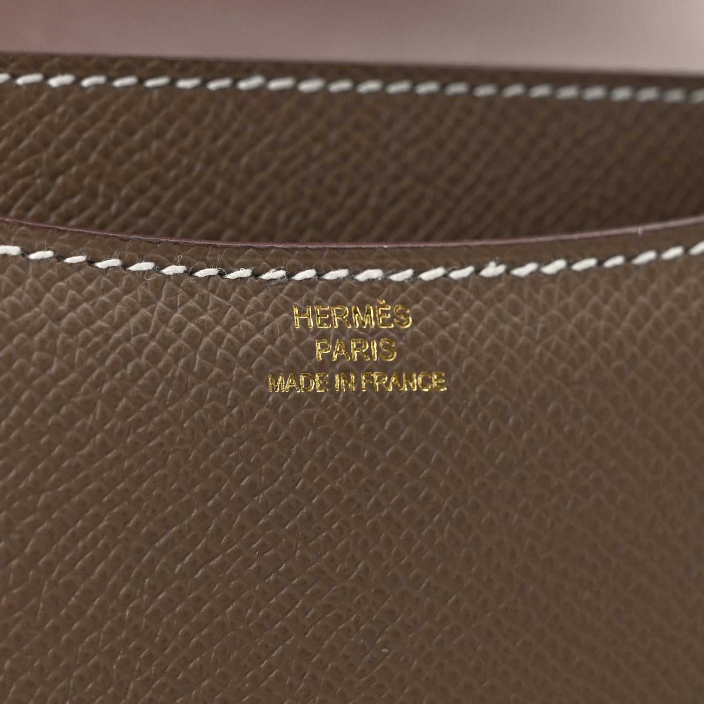 This is an authentic HERMES Epsom Constance 18 in Etoupe. This stylish shoulder bag is finely crafted of epsom calfskin leather in taupe. The bag features a long shoulder strap with gold-plated hardware, including an H buckle on the flap. This opens to a compact partitioned leather interior with flat pockets.Follow this item for alerts. Hermes is a registered trademark of Hermes. FASHIONPHILE is not affiliated with Hermes.