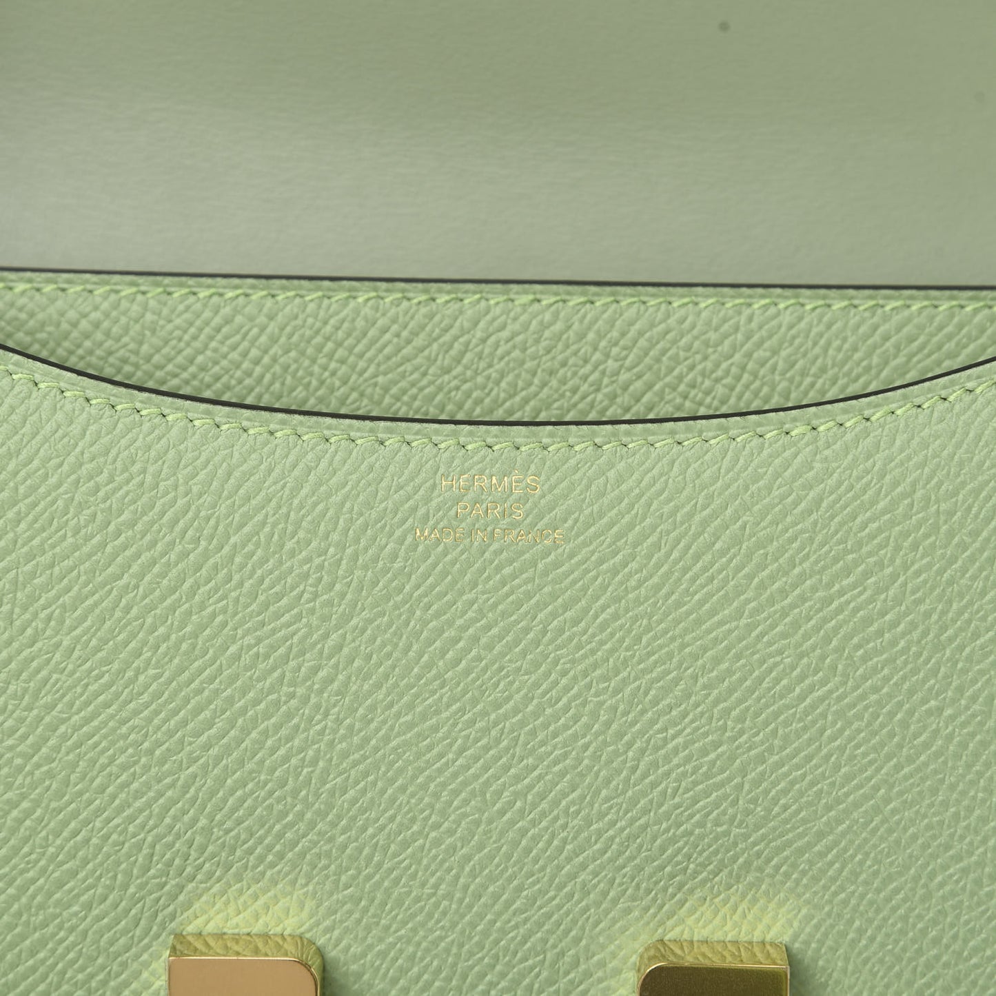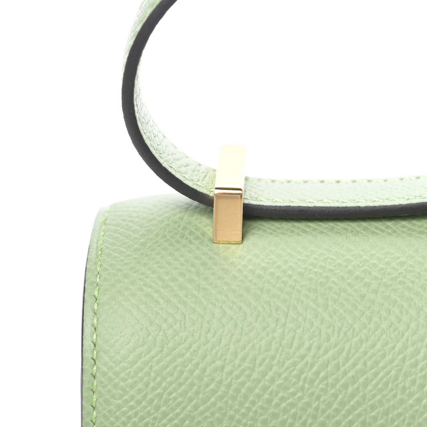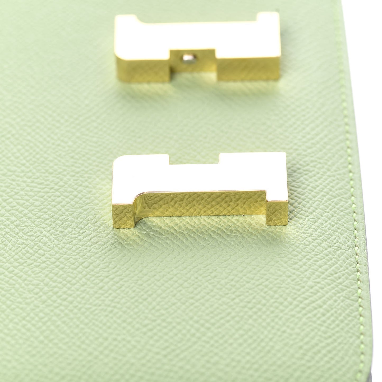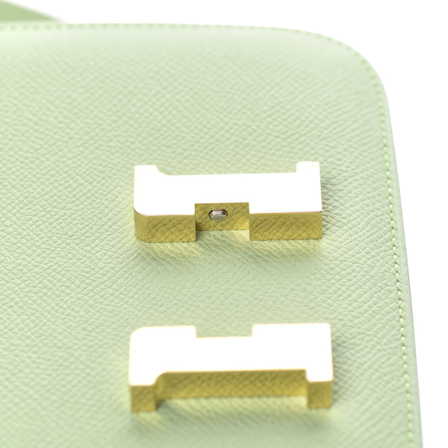 This is an authentic HERMES Epsom Constance 18 in Vert Criquet. This stylish shoulder bag is finely crafted of epsom calfskin leather in mint green. The bag features a crossbody strap with polished gold plated hardware including an H buckle at the frontal flap. The flap opens to a compact partitioned leather interior with a patch pocket. This is a bold yet sophisticated shoulder bag for day, from Hermes!Follow this item for alerts. Hermes is a registered trademark of Hermes. FASHIONPHILE is not affiliated with Hermes.