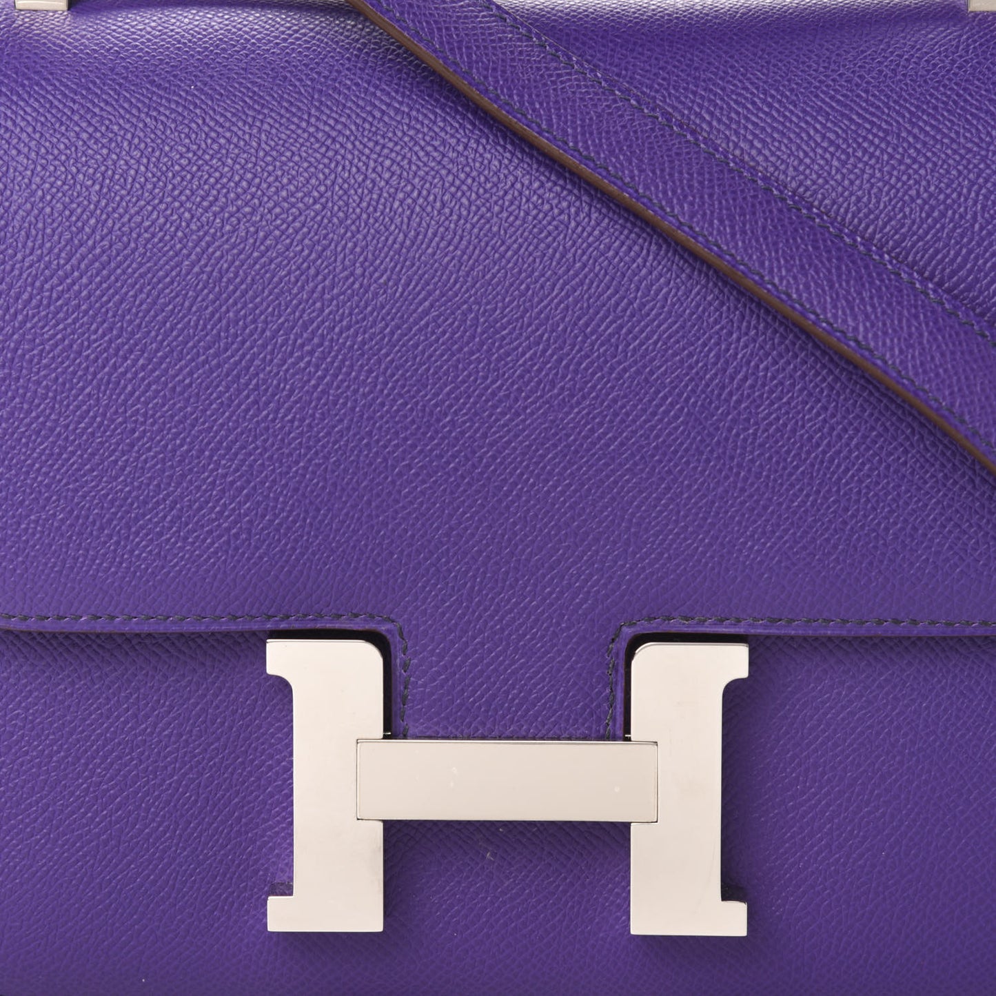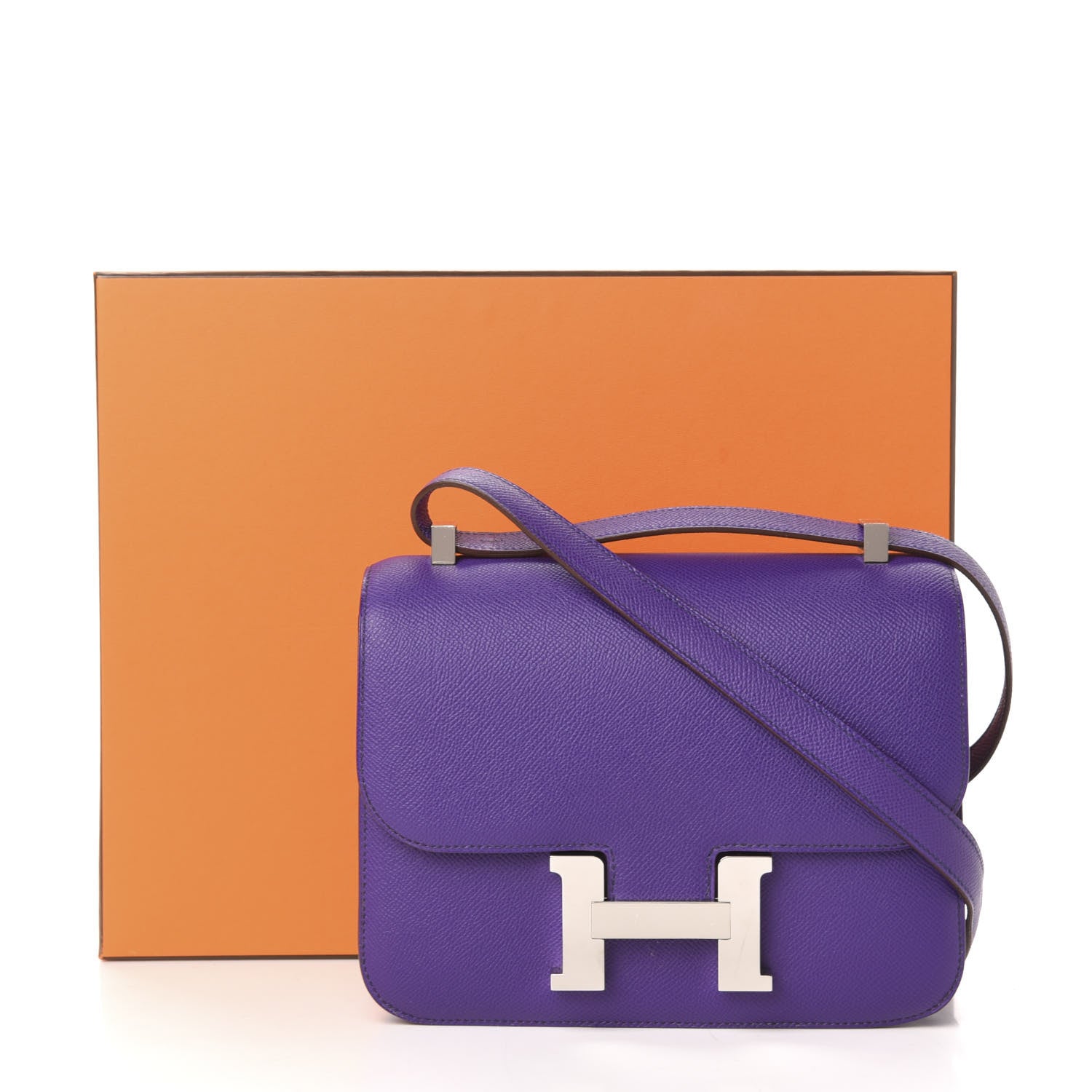 This is an authentic HERMES Epsom Constance 24 in Crocus. This stylish shoulder bag is finely crafted of epsom calfskin leather in dark purple. The bag features a shoulder strap with palladium plated hardware including an H buckle at the flap. This opens to a compact partitioned leather interior with a zipper pocket.