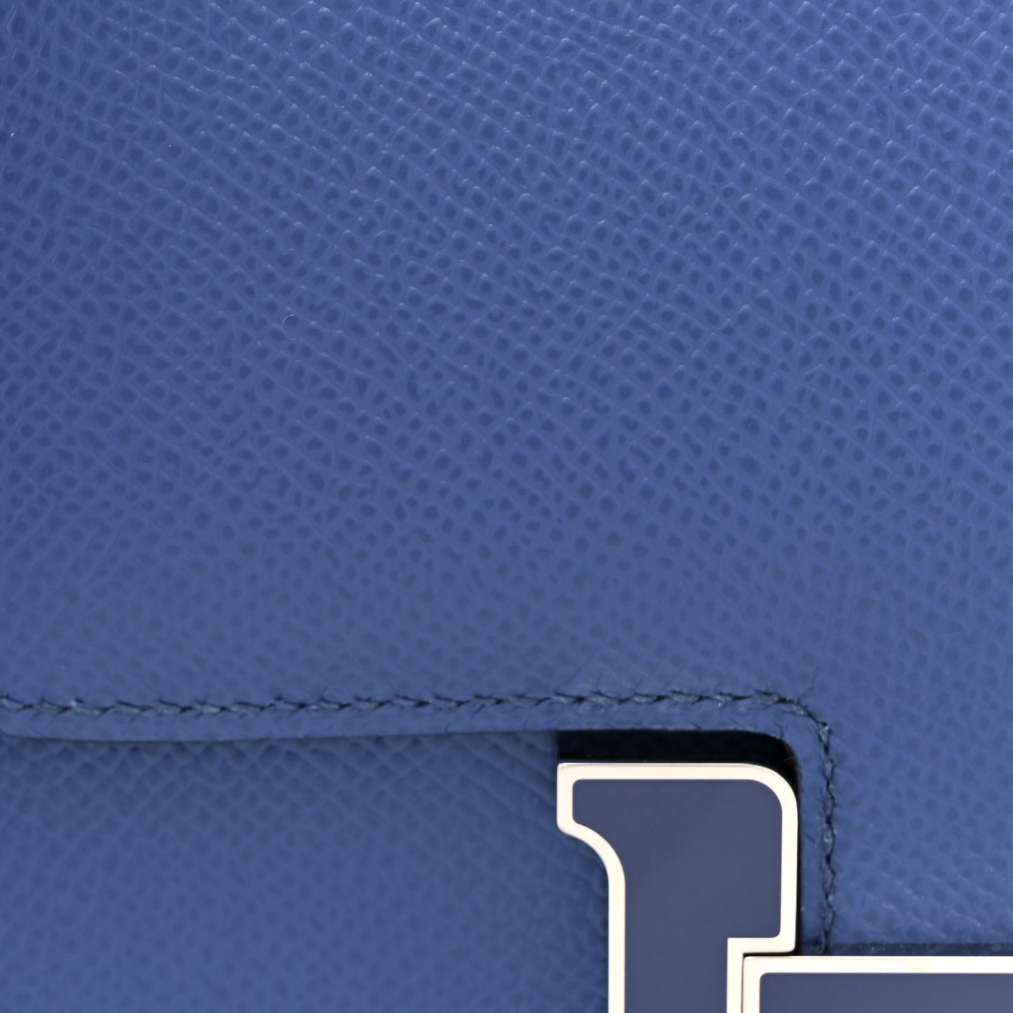 This is an authentic HERMES Epsom Enamel Constance 18 in Bleu France. This chic small bag is crafted with blue Epsom calfskin leather. It features a leather cross-body shoulder strap, expandable sides, a facing flap and a polished enamel inlaid a silver palladium-plated Hermes H logo. The flap opens to a partitioned leather interior with a patch pocket.