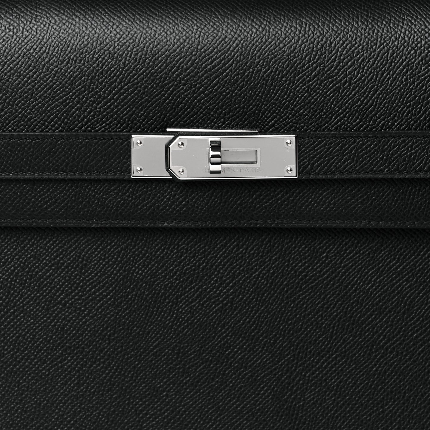 This is the authentic HERMES Epsom Kelly Depeches 36 in Black. This stylish tote is crafted of luxurious black calfskin leather. The briefcase features a sturdy reinforced leather top handle with polished palladium silver links, a cross-over flap with a strap closure and a Kelly signature palladium turn lock. The flap opens to a leather interior with a zipper pocket.Follow this item for alerts. Hermes is a registered trademark of Hermes. FASHIONPHILE is not affiliated with Hermes.