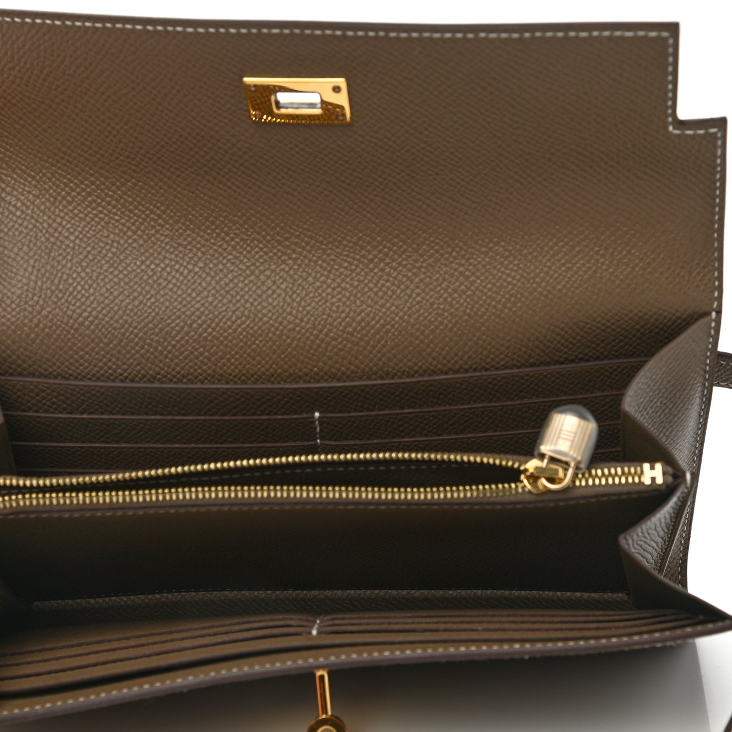 This is an authentic HERMES Epsom Kelly Longue Wallet in Etoupe. This chic wallet is crafted of fine epsom stamped calfskin leather in taupe. This wallet features a frontal flap, strap, and a polished gold plated turn-lock in the signature Kelly style. The flap opens to a partitioned leather interior with card slots, patch pockets, and a zipper compartment.Follow this item for alerts. Hermes is a registered trademark of Hermes. FASHIONPHILE is not affiliated with Hermes.