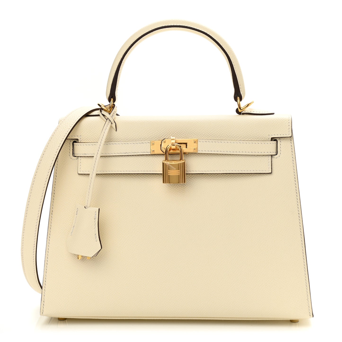 This is an authentic HERMES Epsom Kelly Sellier 25 in Nata. This iconic and classic handbag is crafted of beautiful off white leather with white stitching. The bag features a sturdy rolled leather top handle, an optional shoulder strap, and a crossover flap and strap closure with a gold plated signature Kelly turn lock and padlock with a clochette for the keys. This opens to a leather interior with zippered and flat pockets.Follow this item for alerts. Hermes is a registered trademark of Hermes. FASHIONPHILE is not affiliated with Hermes.