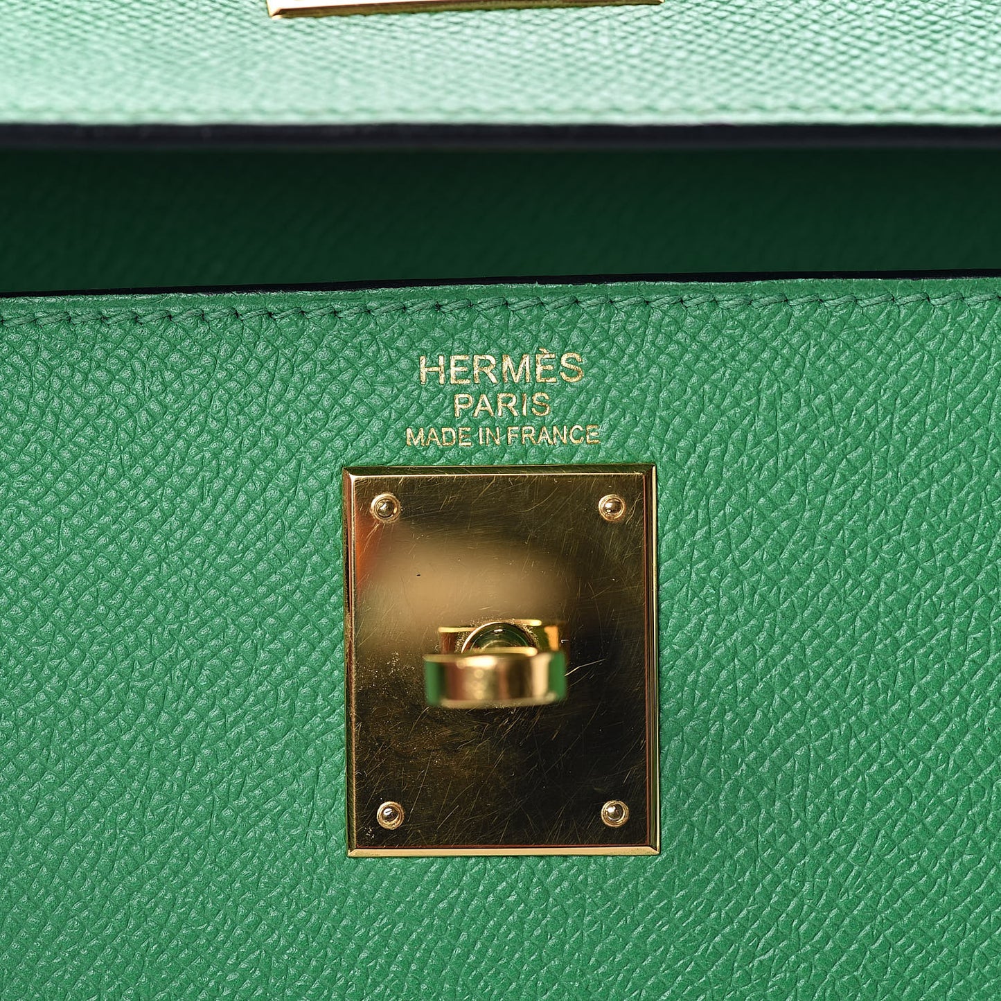 This is an authentic HERMES Epsom Kelly Sellier 32 in Bamboo. This classic tote is crafted of textured green epsom leather and features a sturdy rolled leather top handle, an optional shoulder strap, and a crossover flap with a polished gold plated Kelly turn lock and strap closure. This opens to a spacious matching leather interior with zipper and patch pockets. This stylish bag is suitable for every occasion, with the classic sophistication only from Hermes!Follow this item for alerts. Hermes is a registered trademark of Hermes. FASHIONPHILE is not affiliated with Hermes.