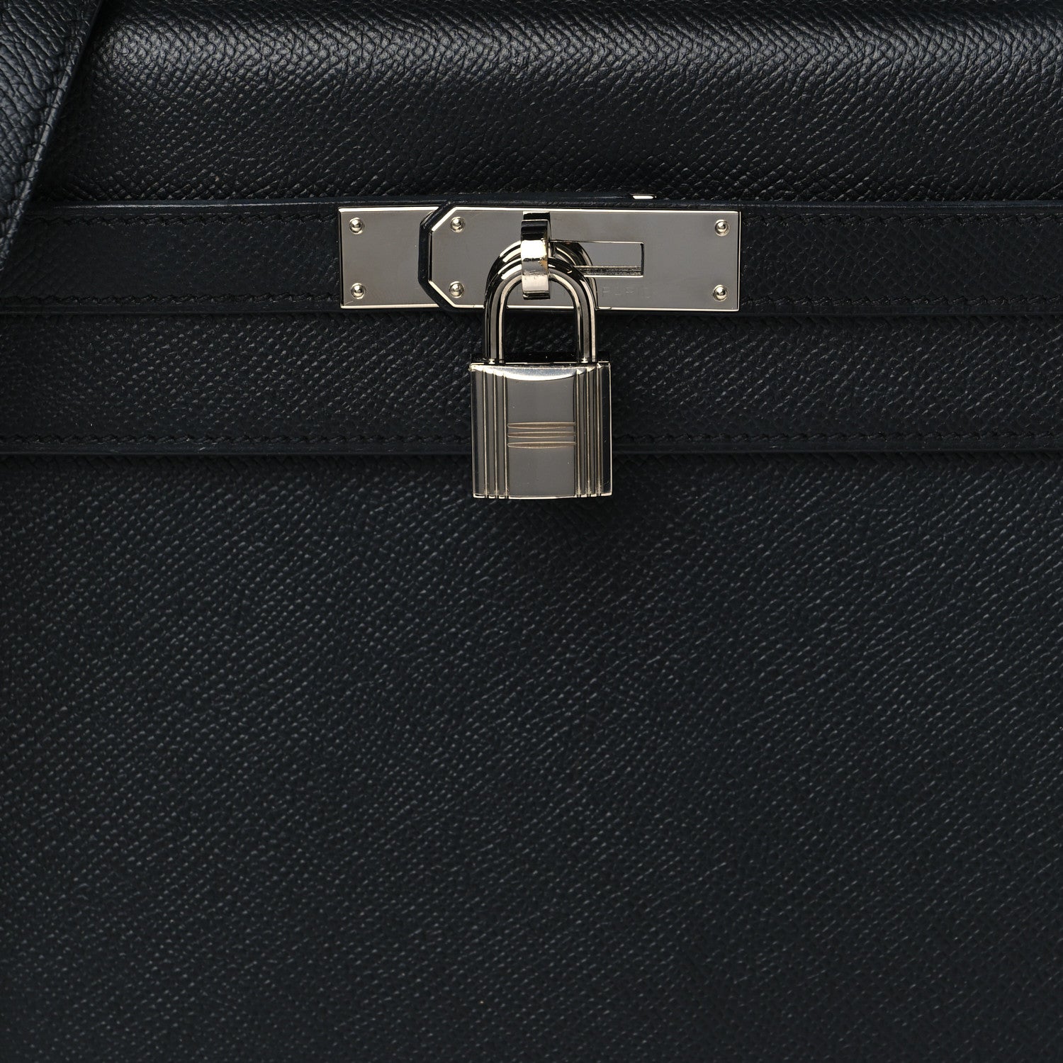 This is the authentic HERMES Epsom Kelly Sellier 32 in Black. This stylish tote is crafted of beautifully textured Epsom calfskin leather. The bag features a reinforced leather top handle with polished palladium links, an optional shoulder strap with palladium clasps, a cross-over flap and strap closure and a palladium-plated Kelly turn lock, and a clochette with keys and accompanying padlock. This Kelly opens to a black matte leather interior with zipper and patch pockets.